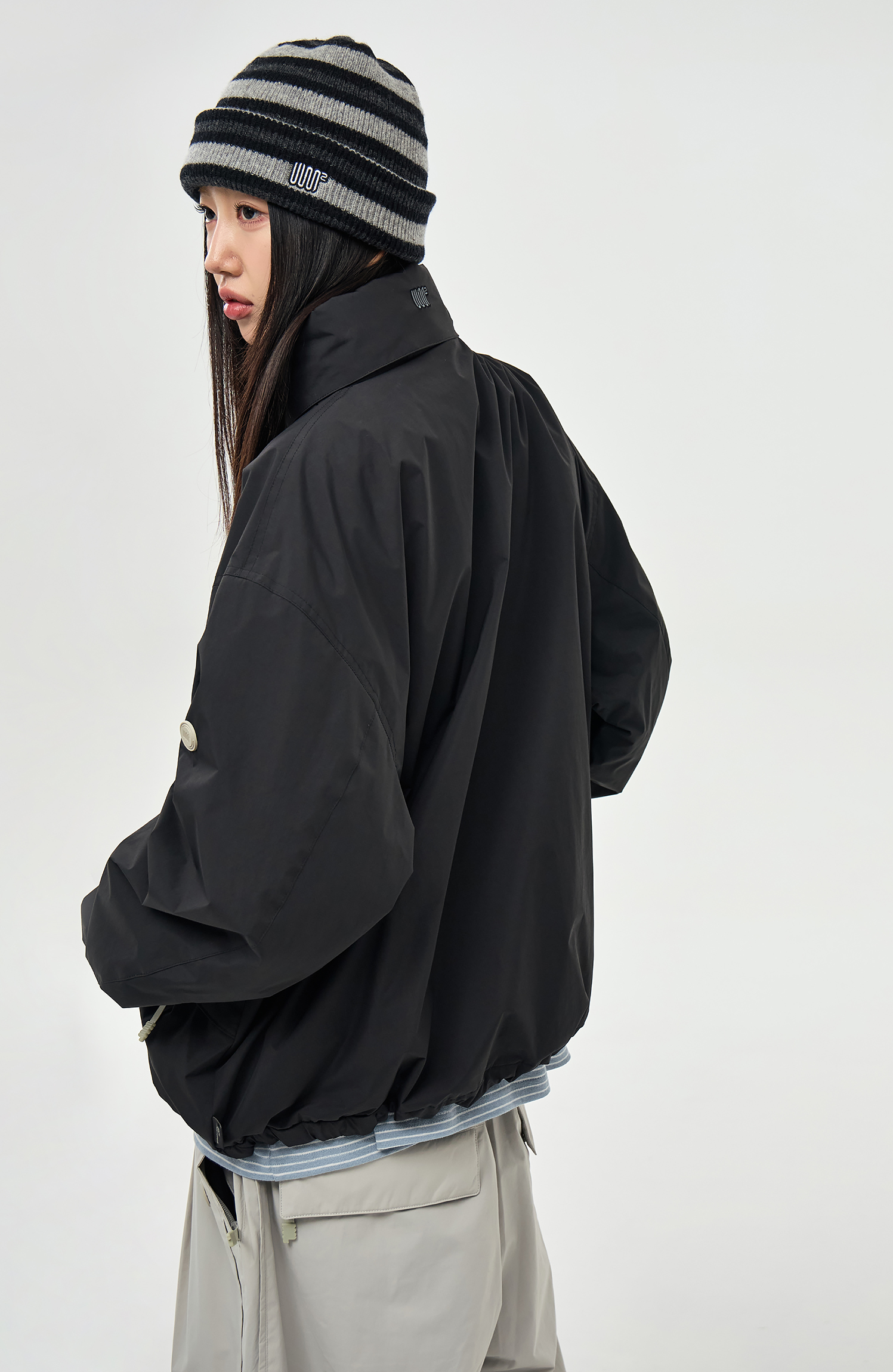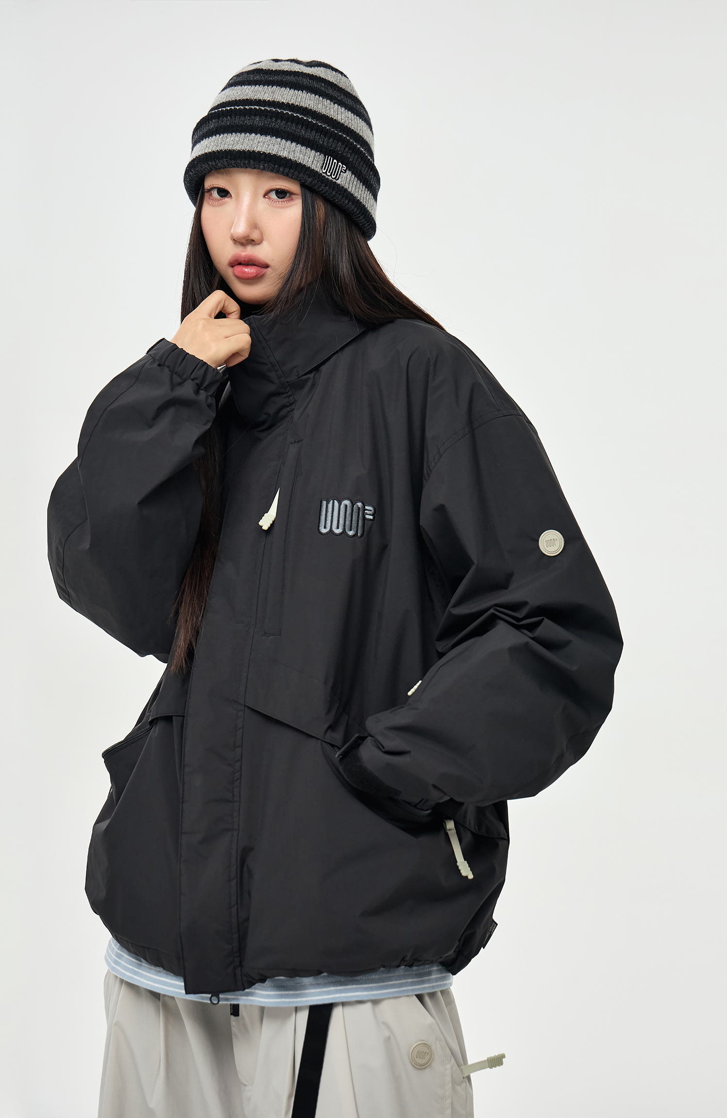 하이넥으로 디자인된 네크라인에는 후드가 내장되어 있어 다양한 환경과 스타일에 따라 자유롭게 연출할 수 있습니다.