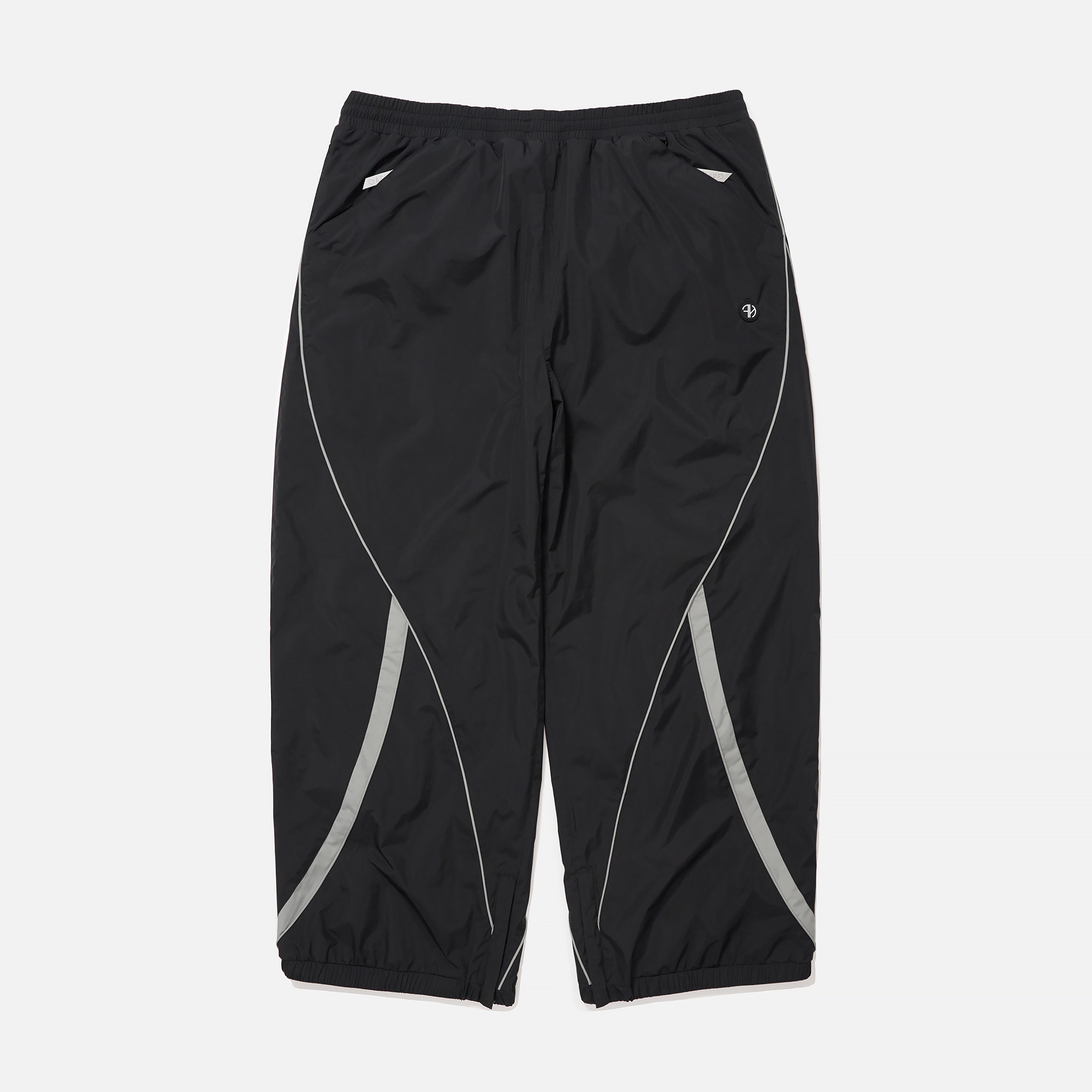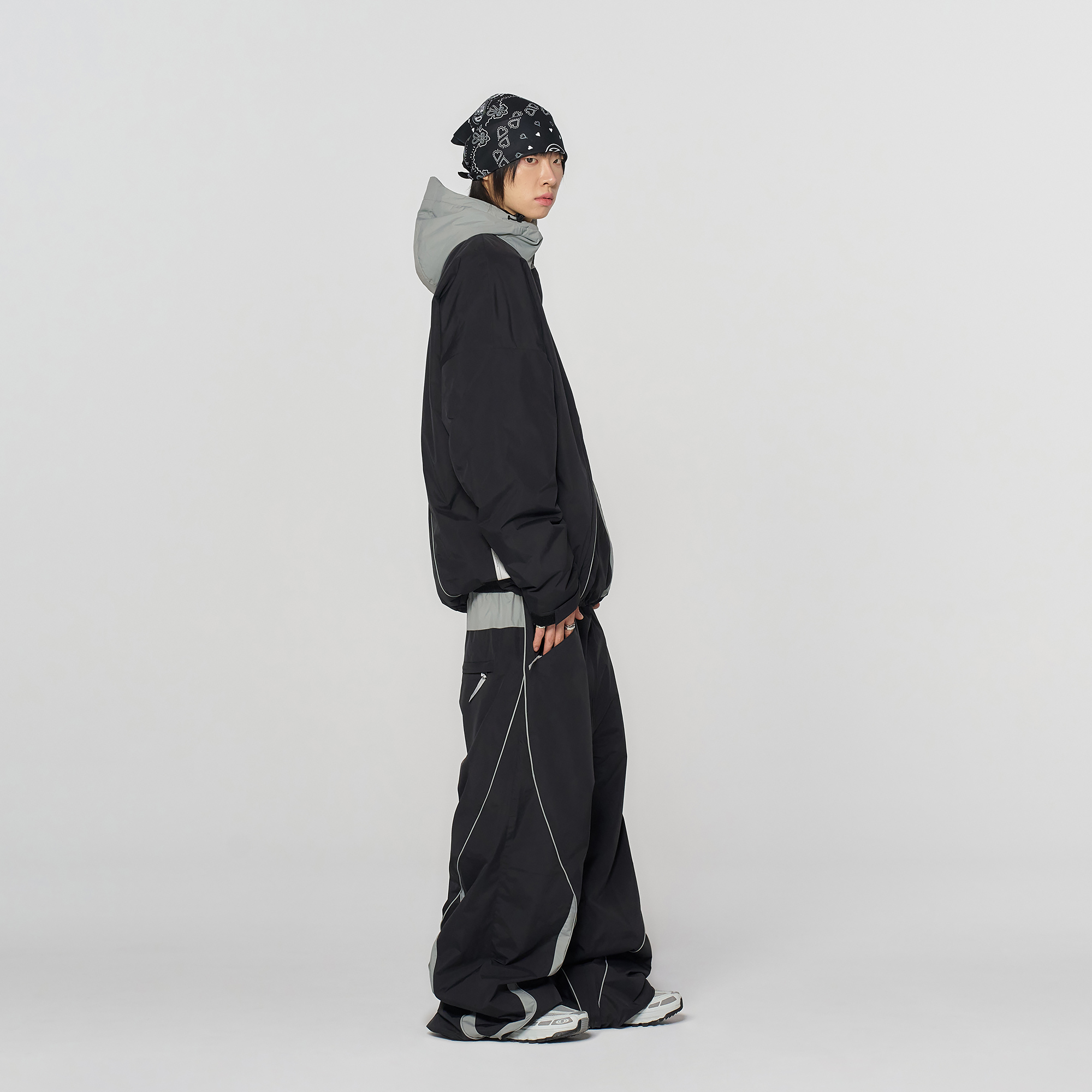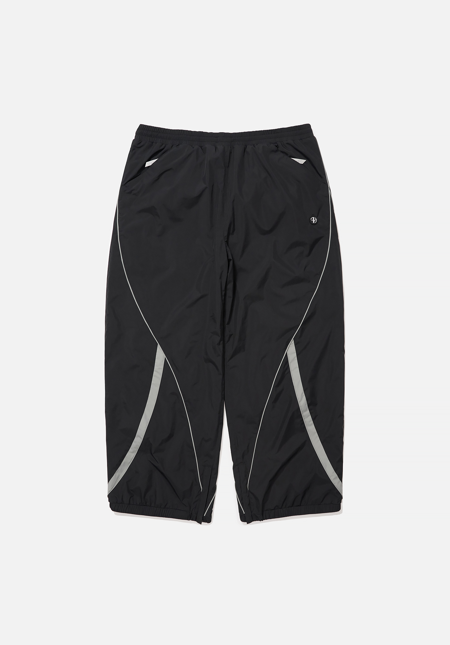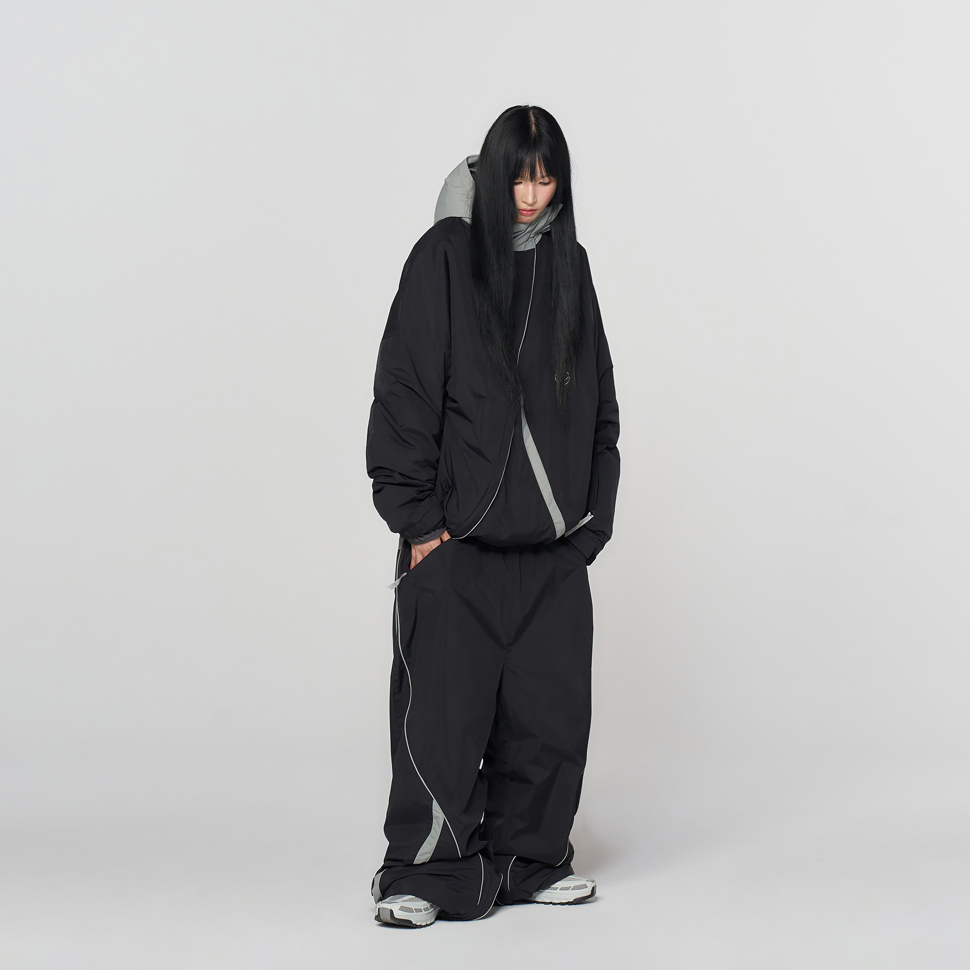 커브드 절개라인을 따라 배치된 파이핑과 컬러 배색이 감각적인 무드를 더하는 와이드 핏의 팬츠입니다.