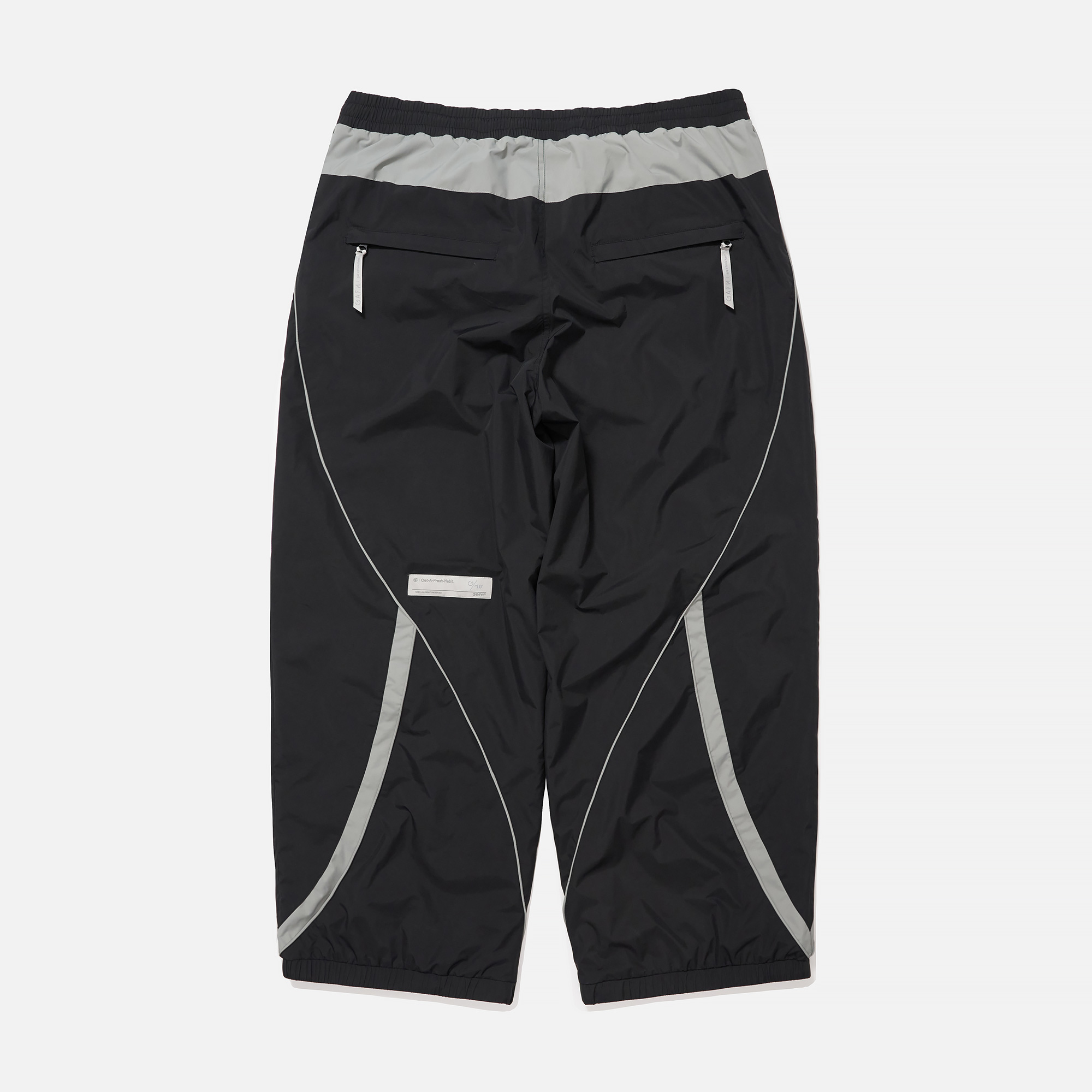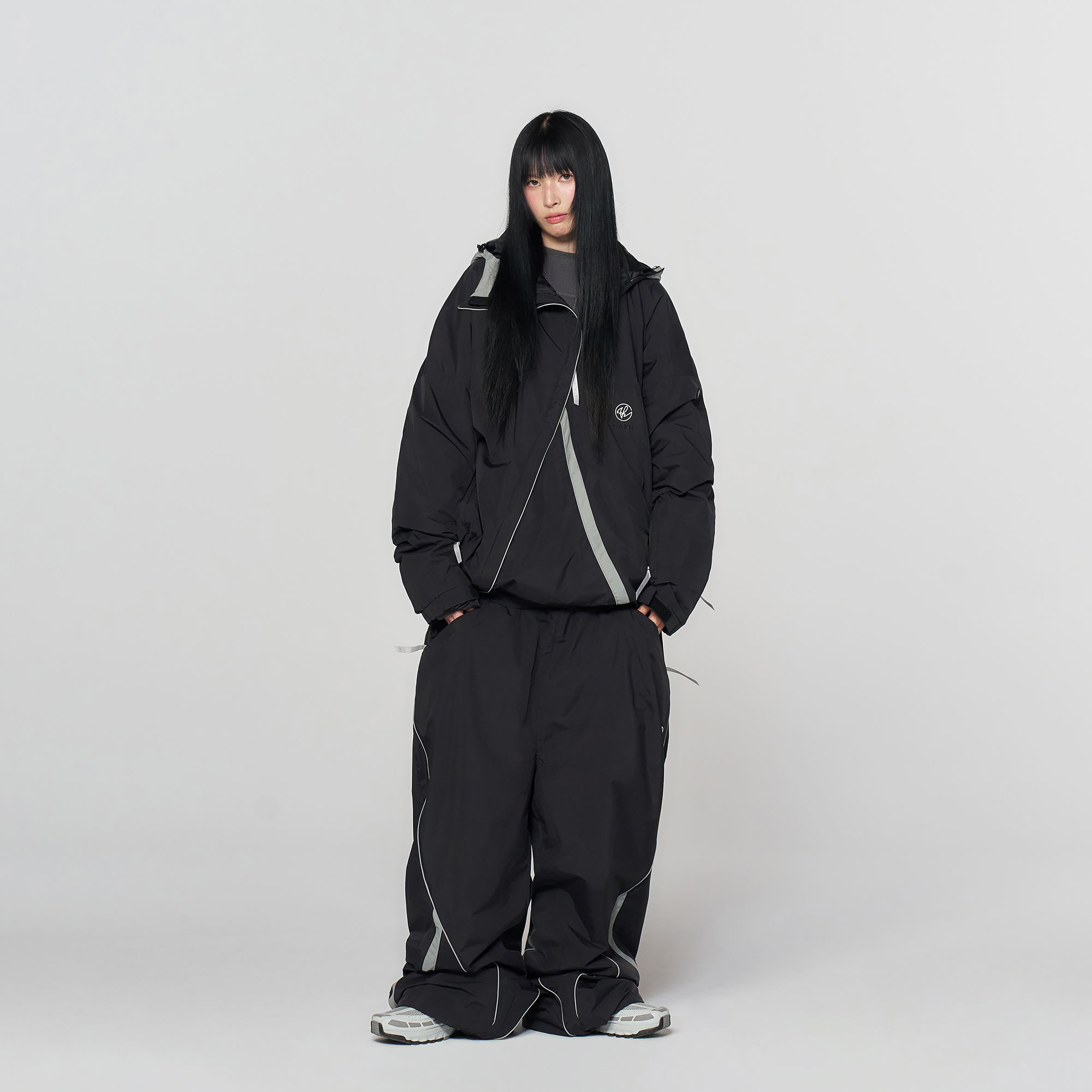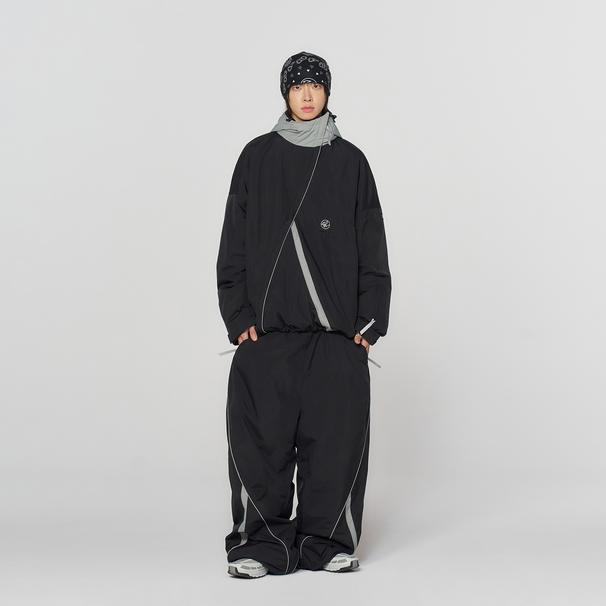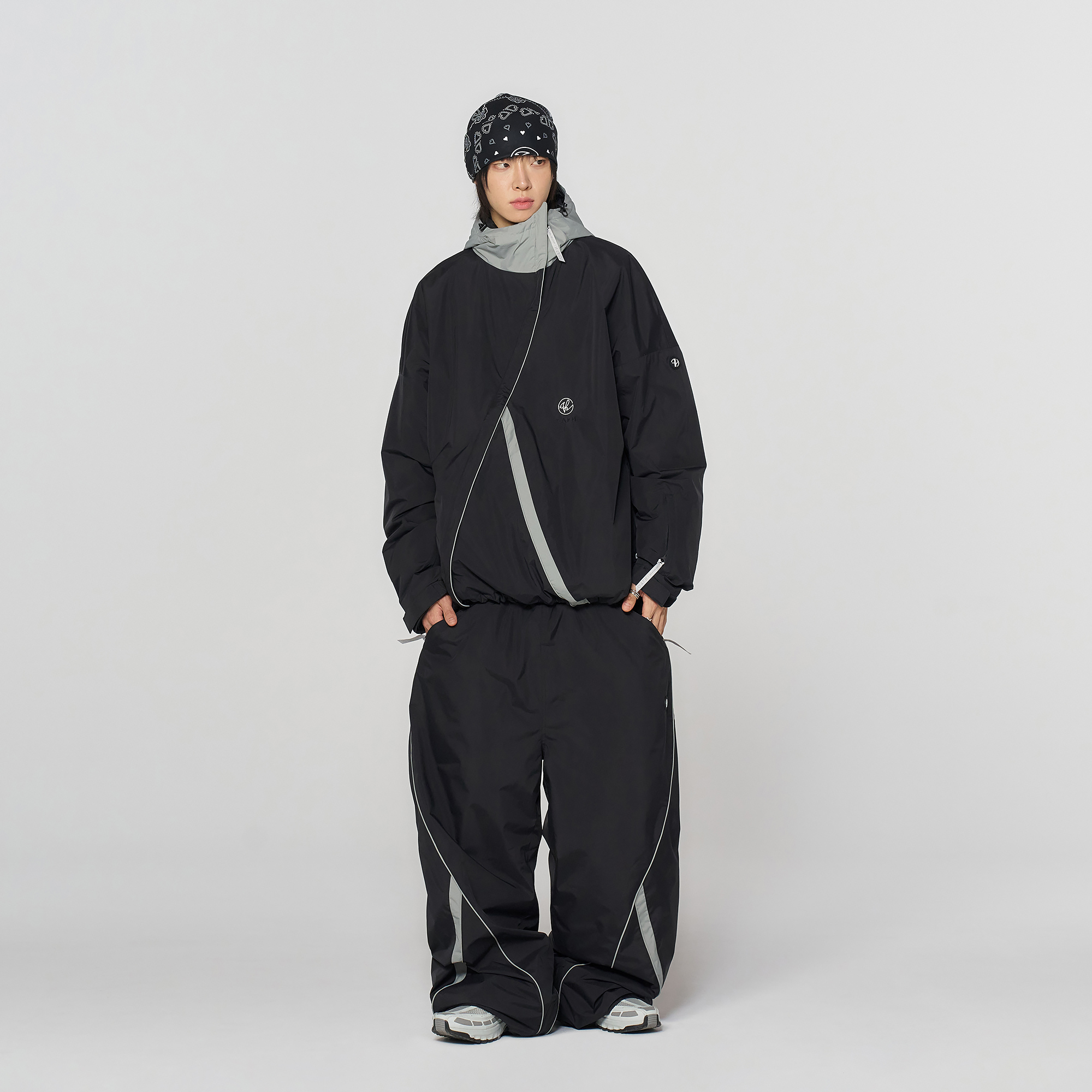 커브드 절개라인을 따라 배치된 파이핑과 컬러 배색이 감각적인 무드를 더하는 와이드 핏의 팬츠입니다.