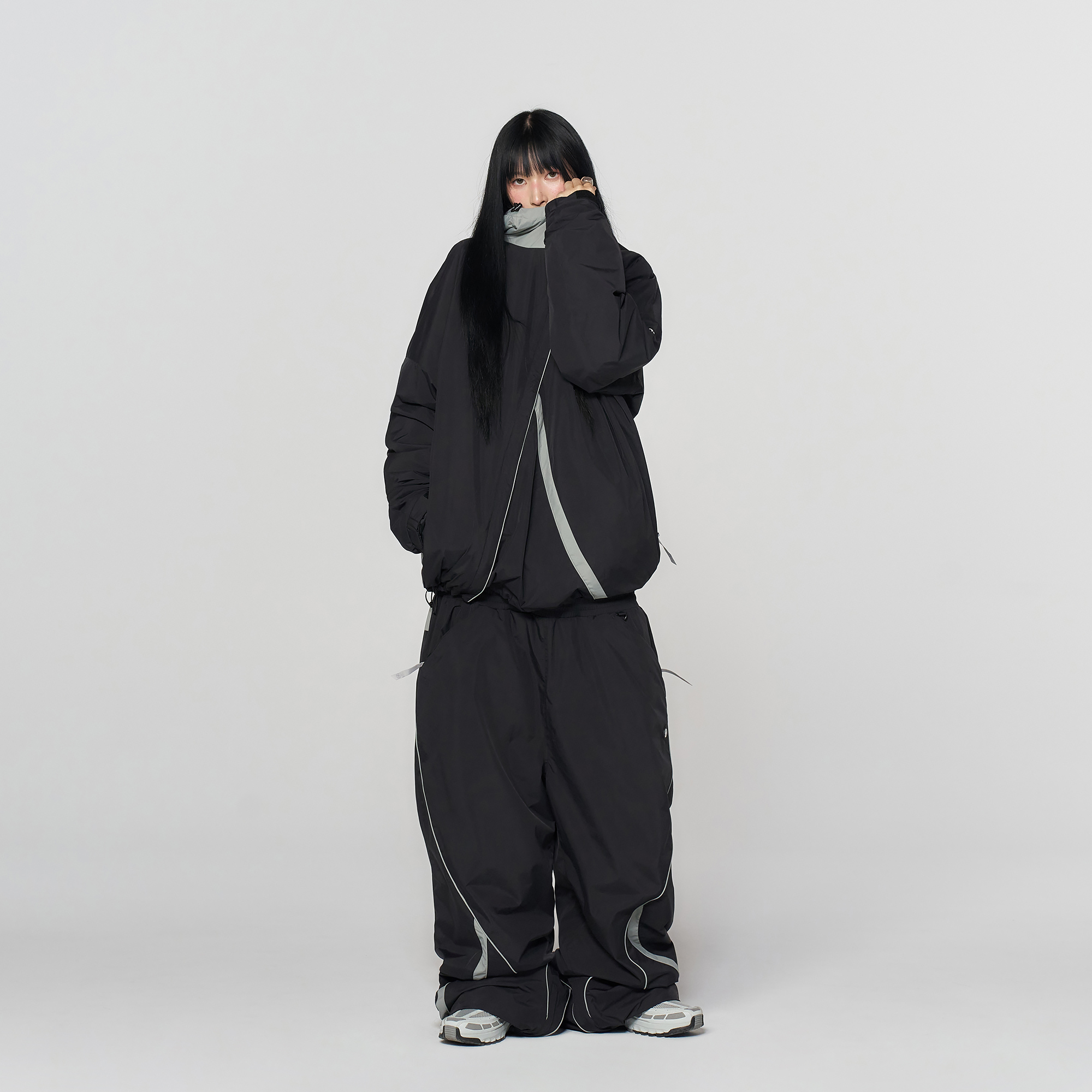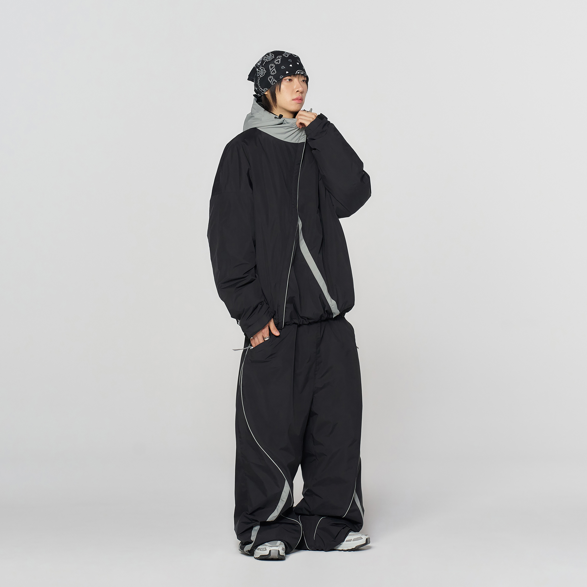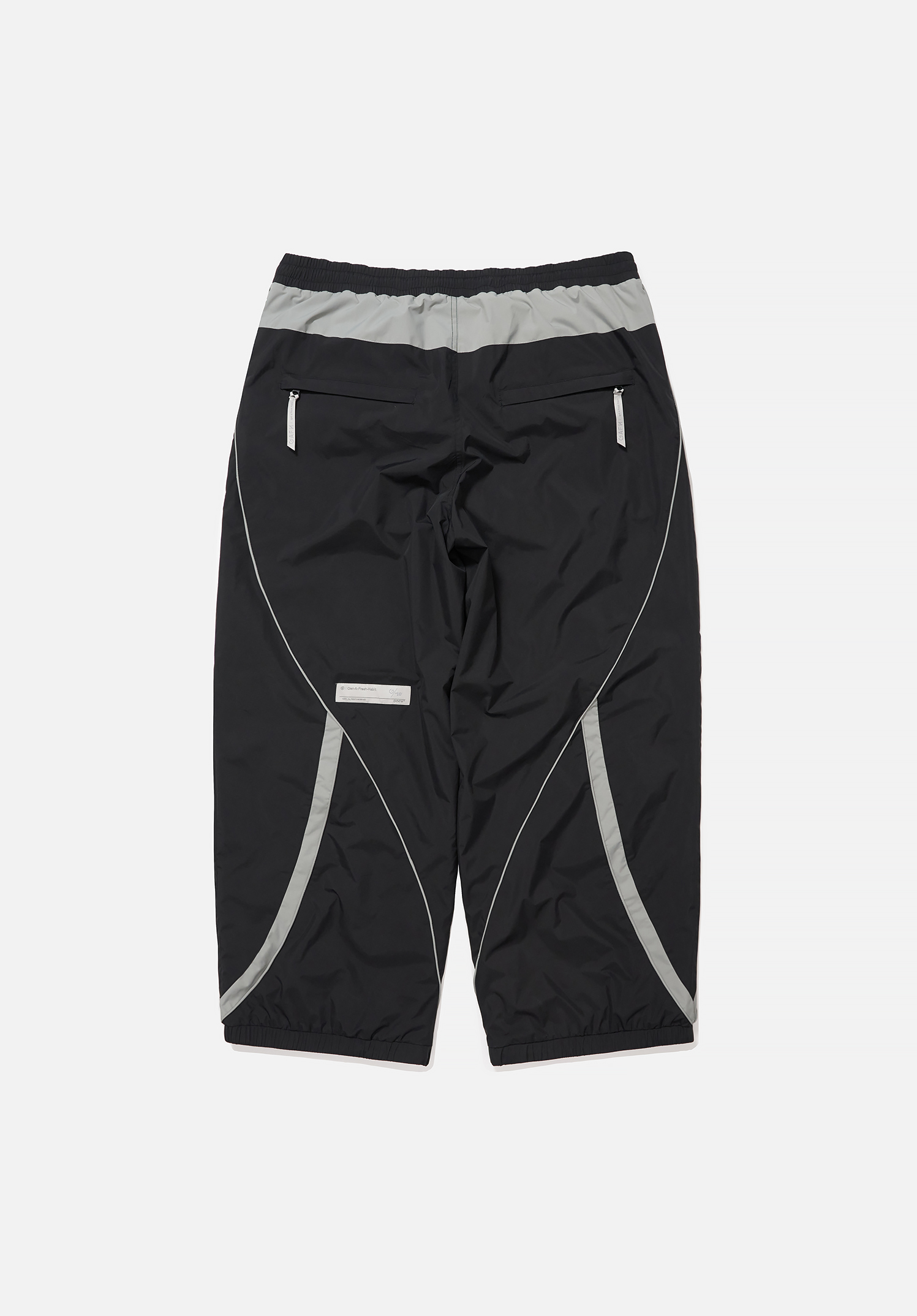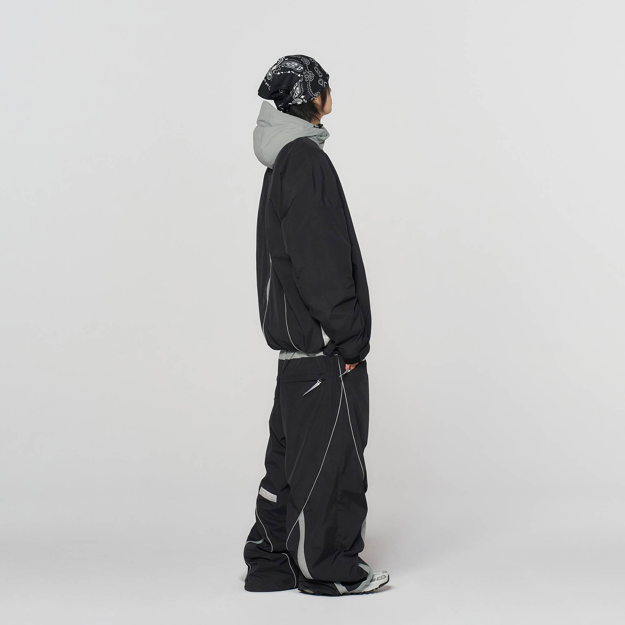 커브드 절개라인을 따라 배치된 파이핑과 컬러 배색이 감각적인 무드를 더하는 와이드 핏의 팬츠입니다.
