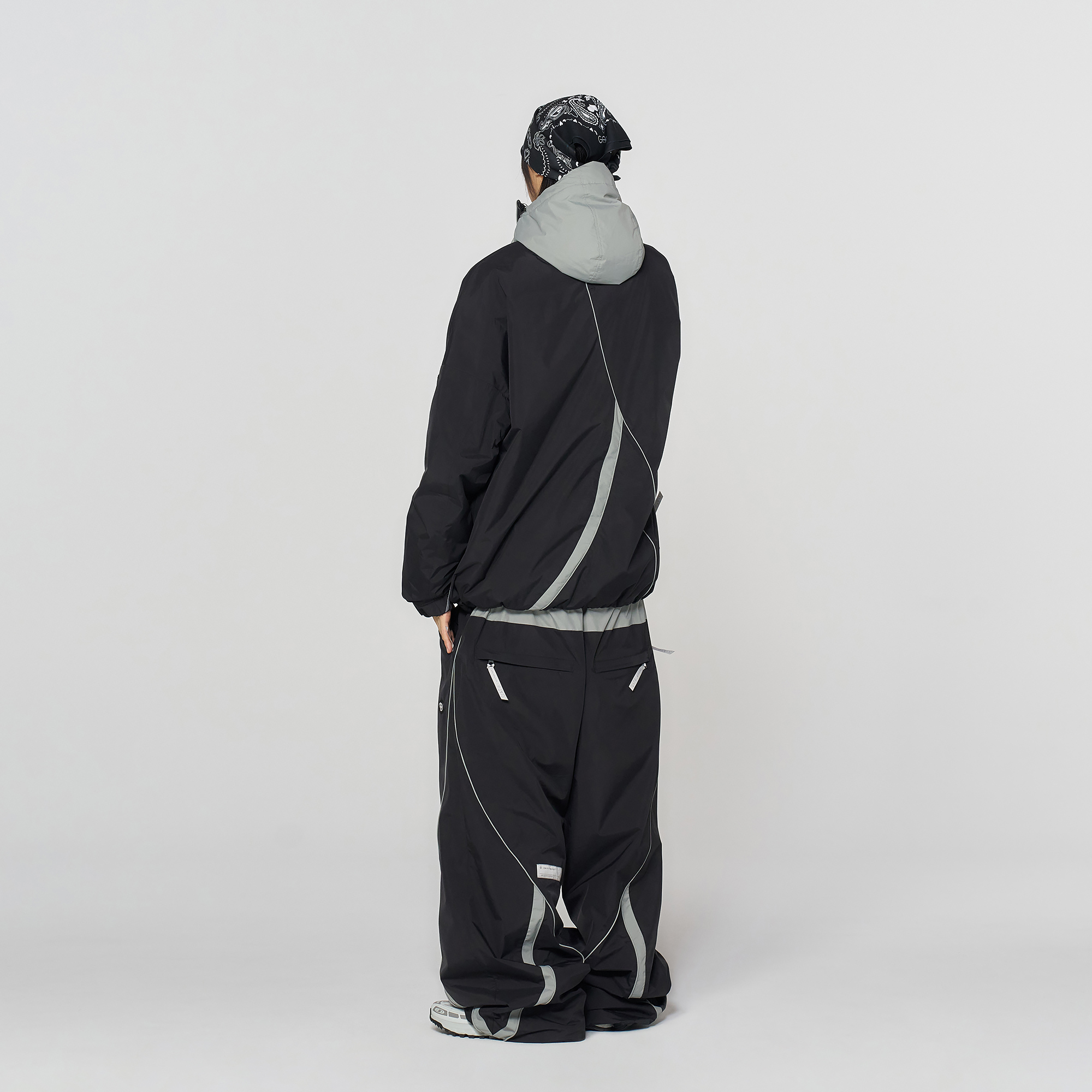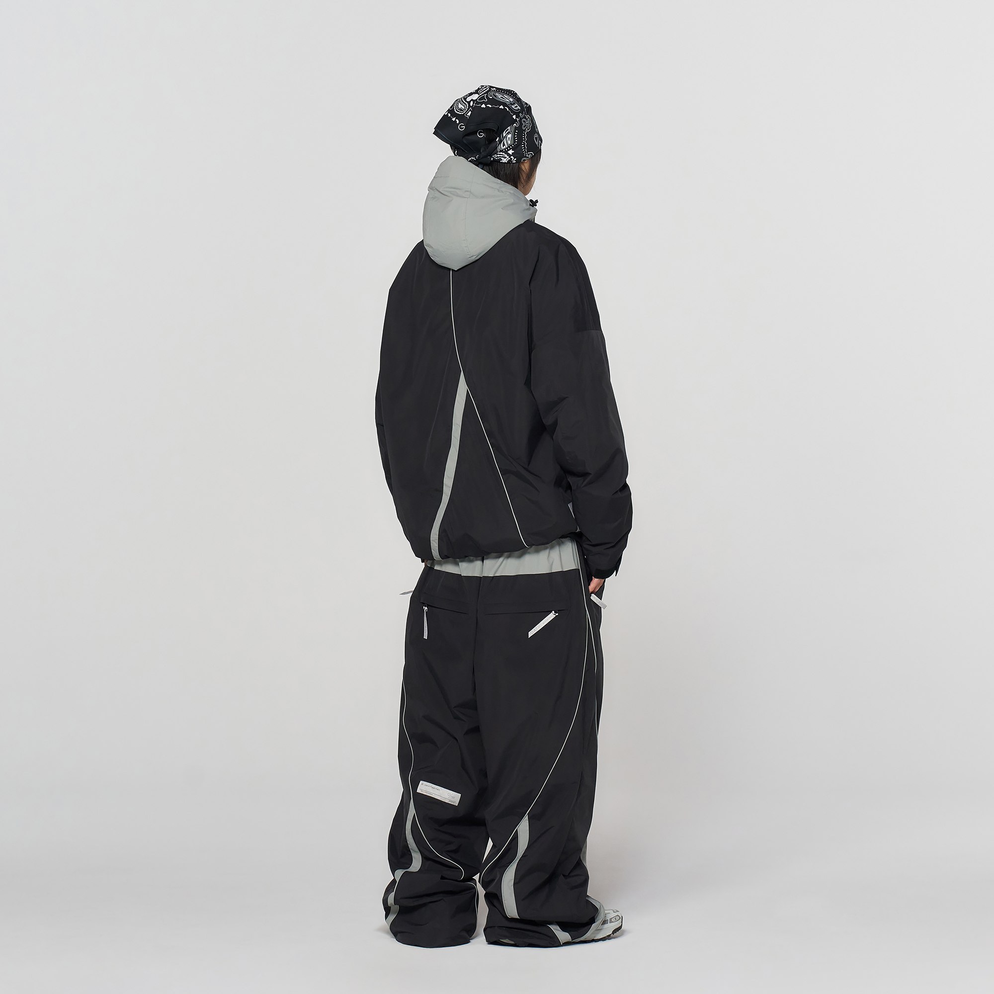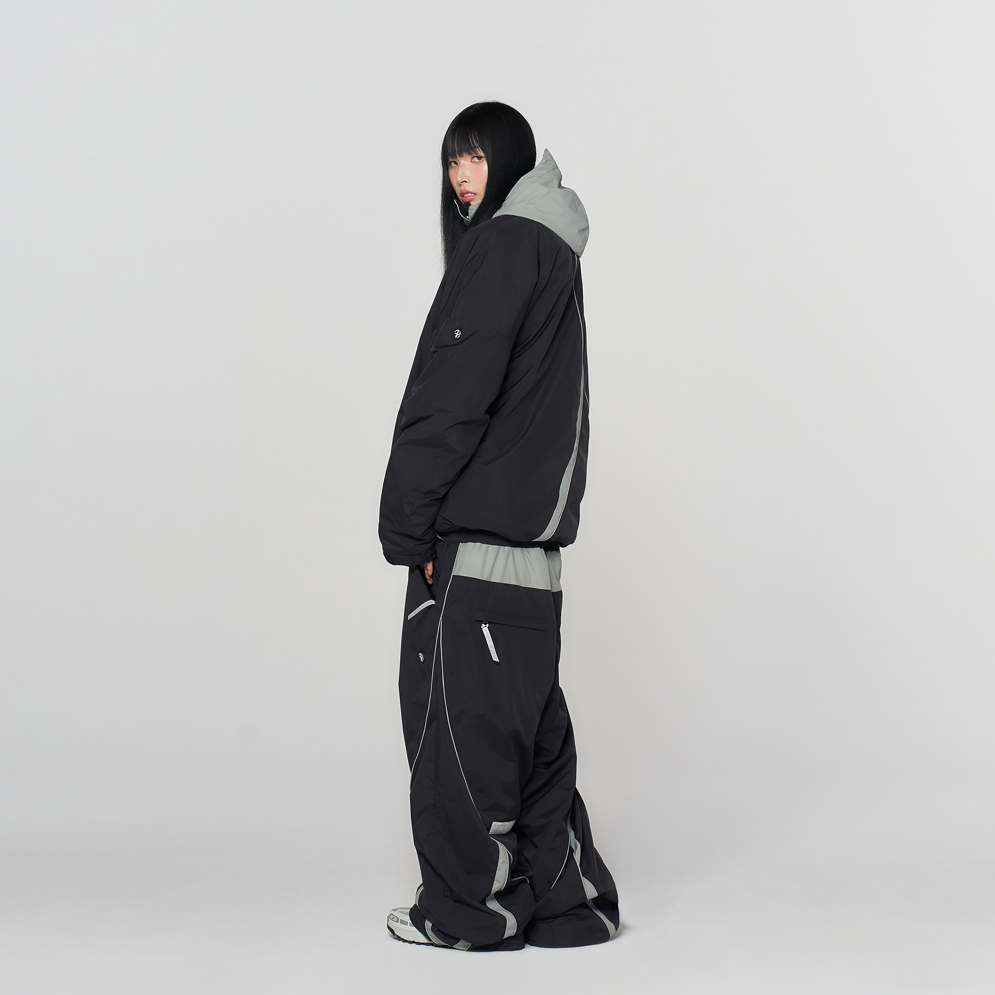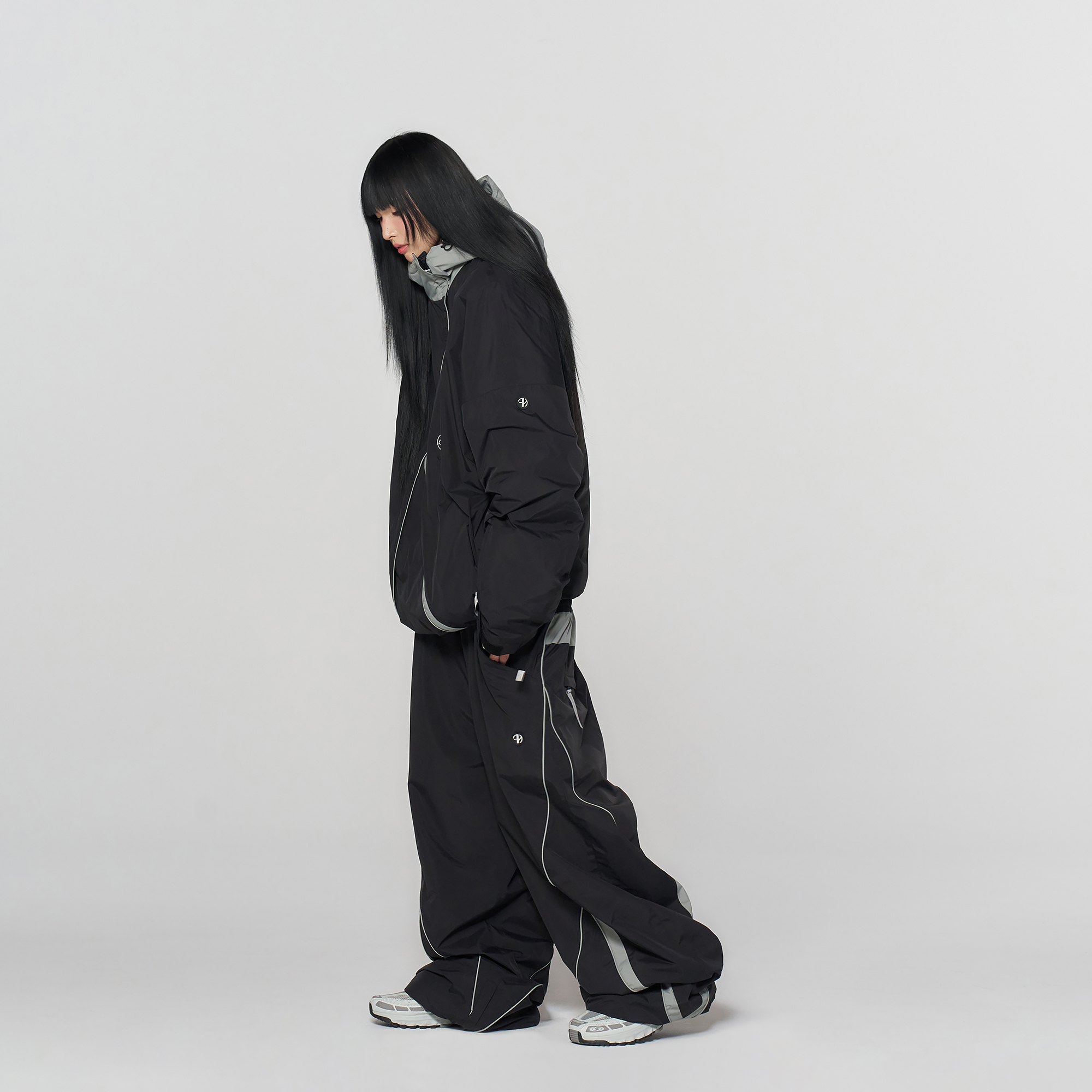 커브드 절개라인을 따라 배치된 파이핑과 컬러 배색이 감각적인 무드를 더하는 와이드 핏의 팬츠입니다.