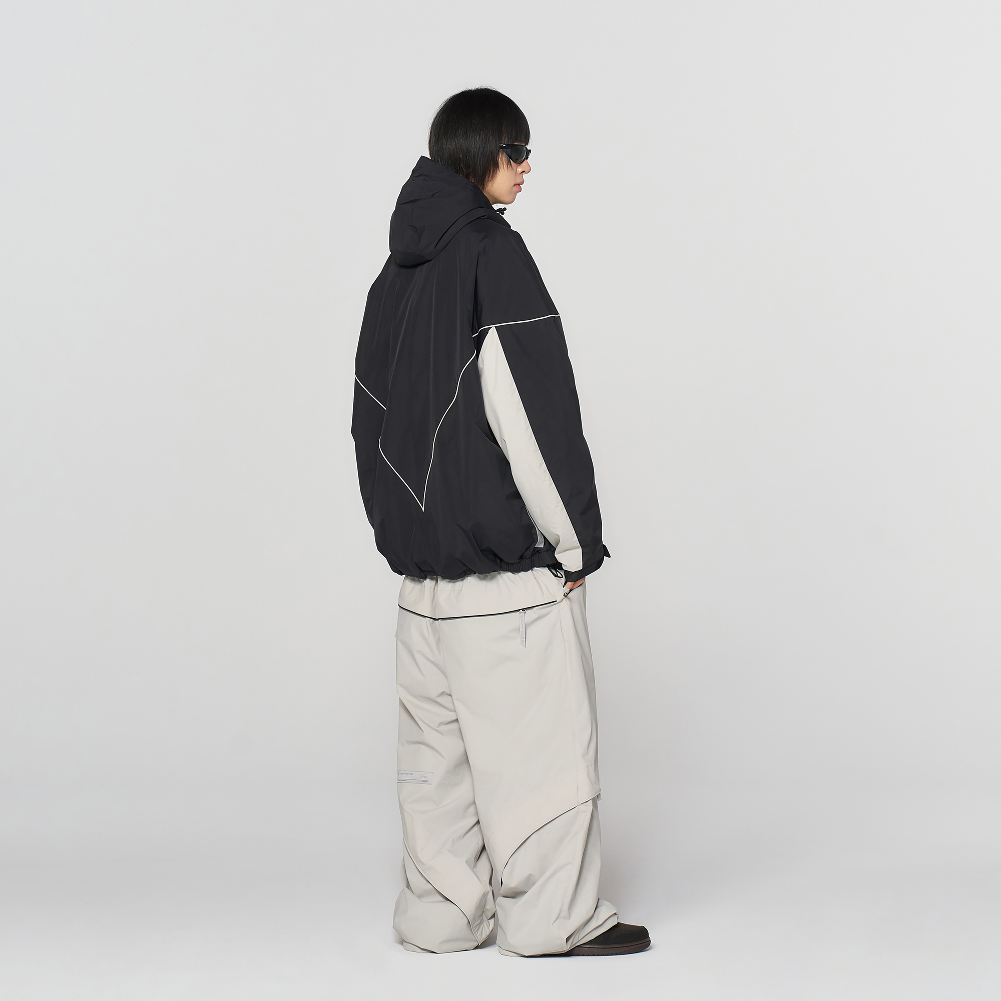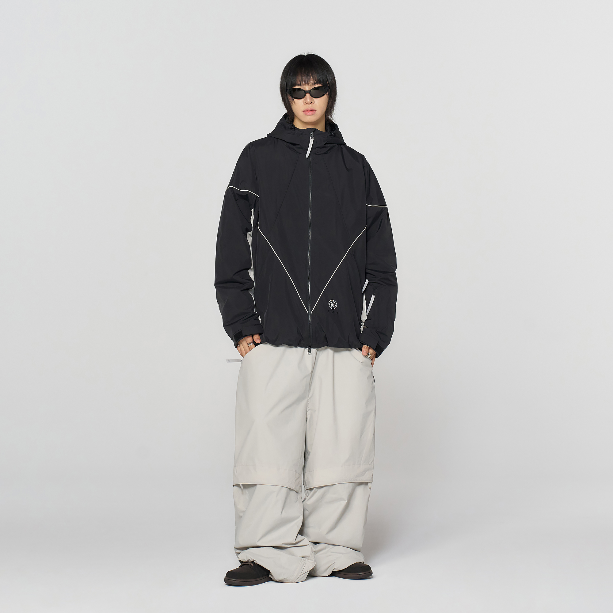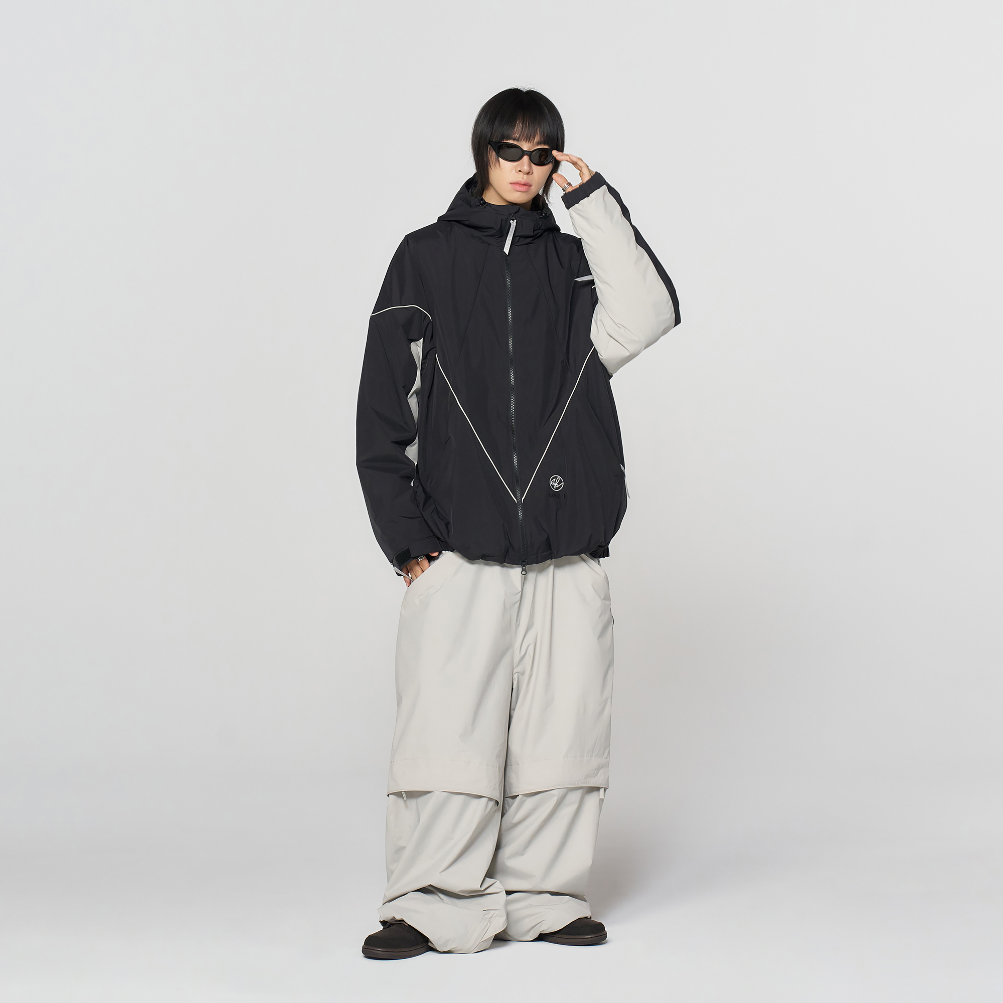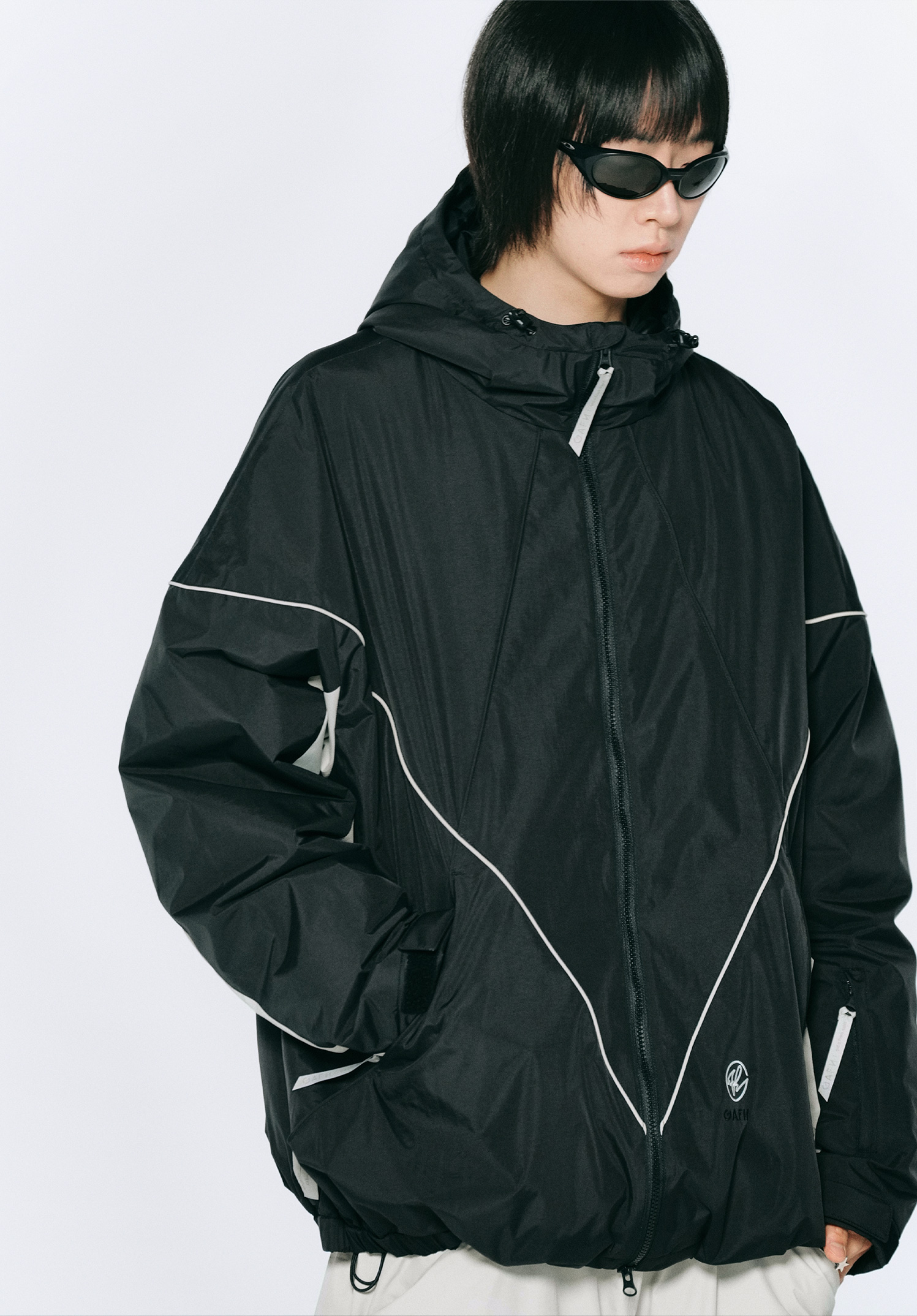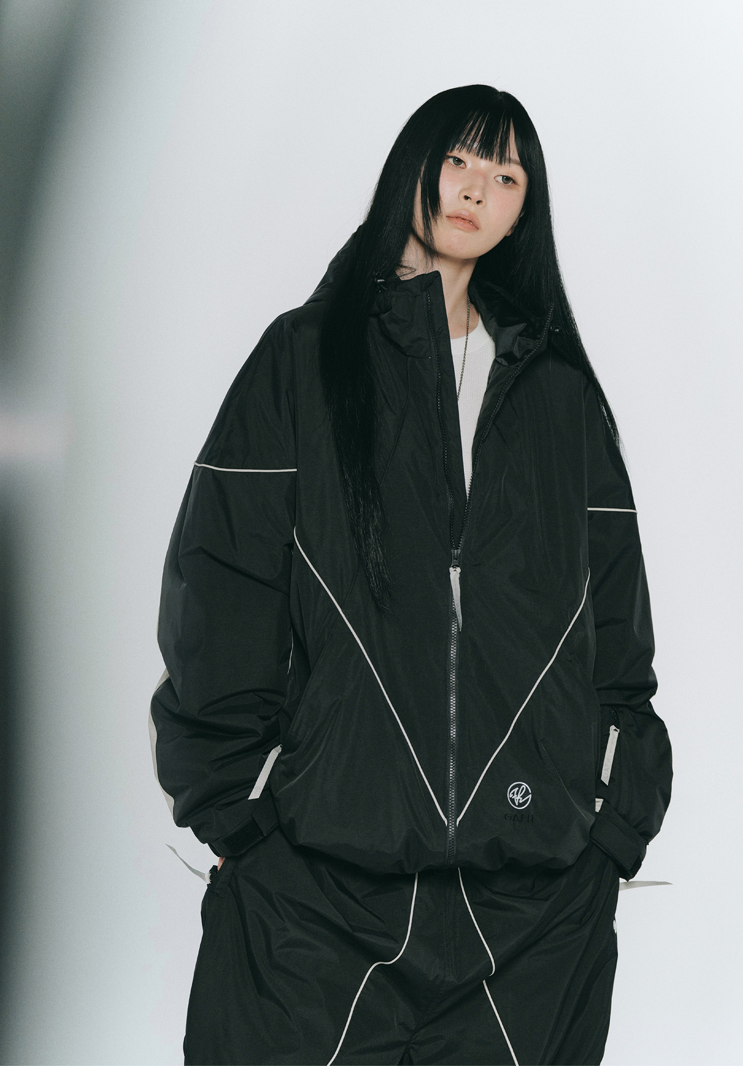 오버핏 실루엣 위에 교차된 파이핑 디테일과 소매 배색이 조화를 이루는 자켓입니다.
