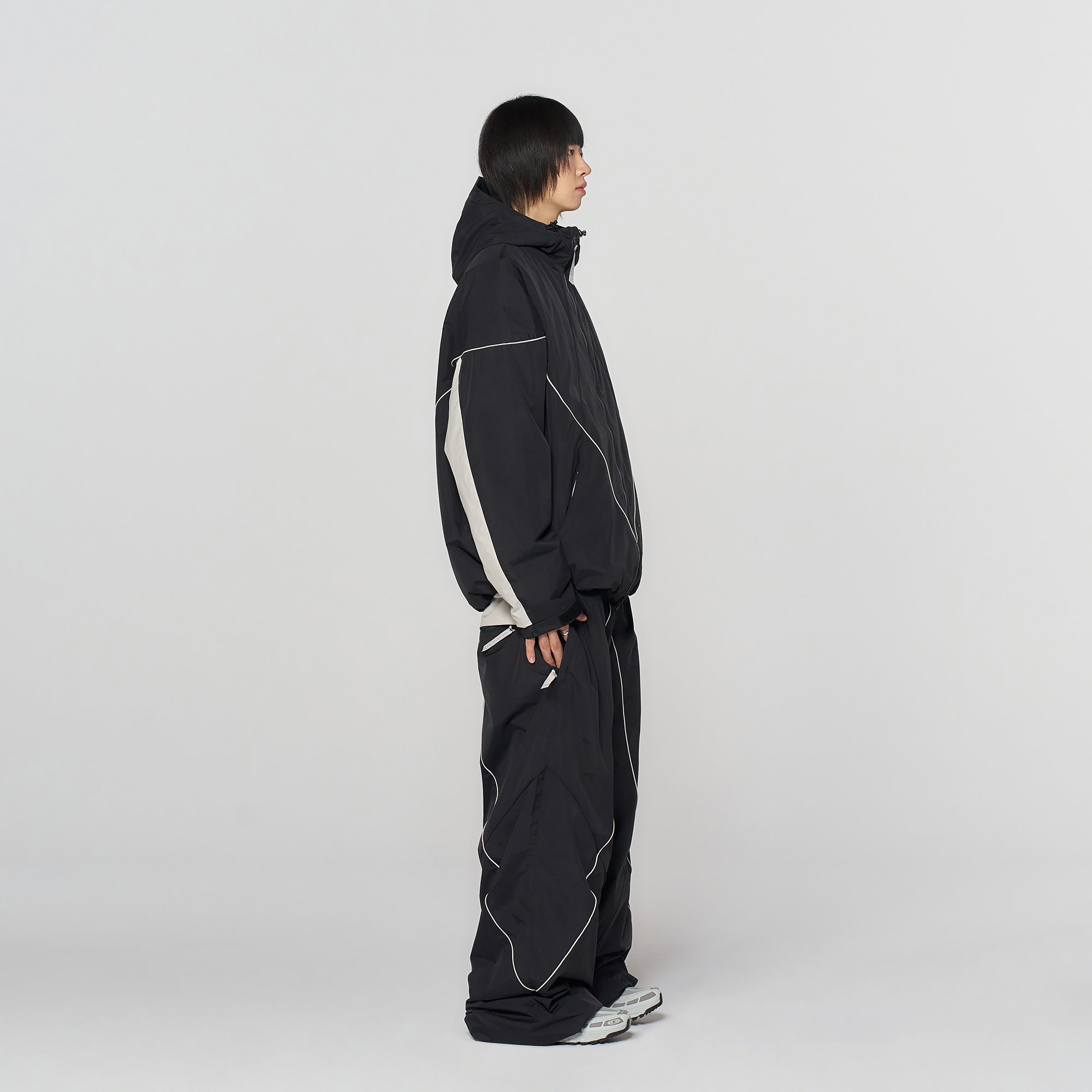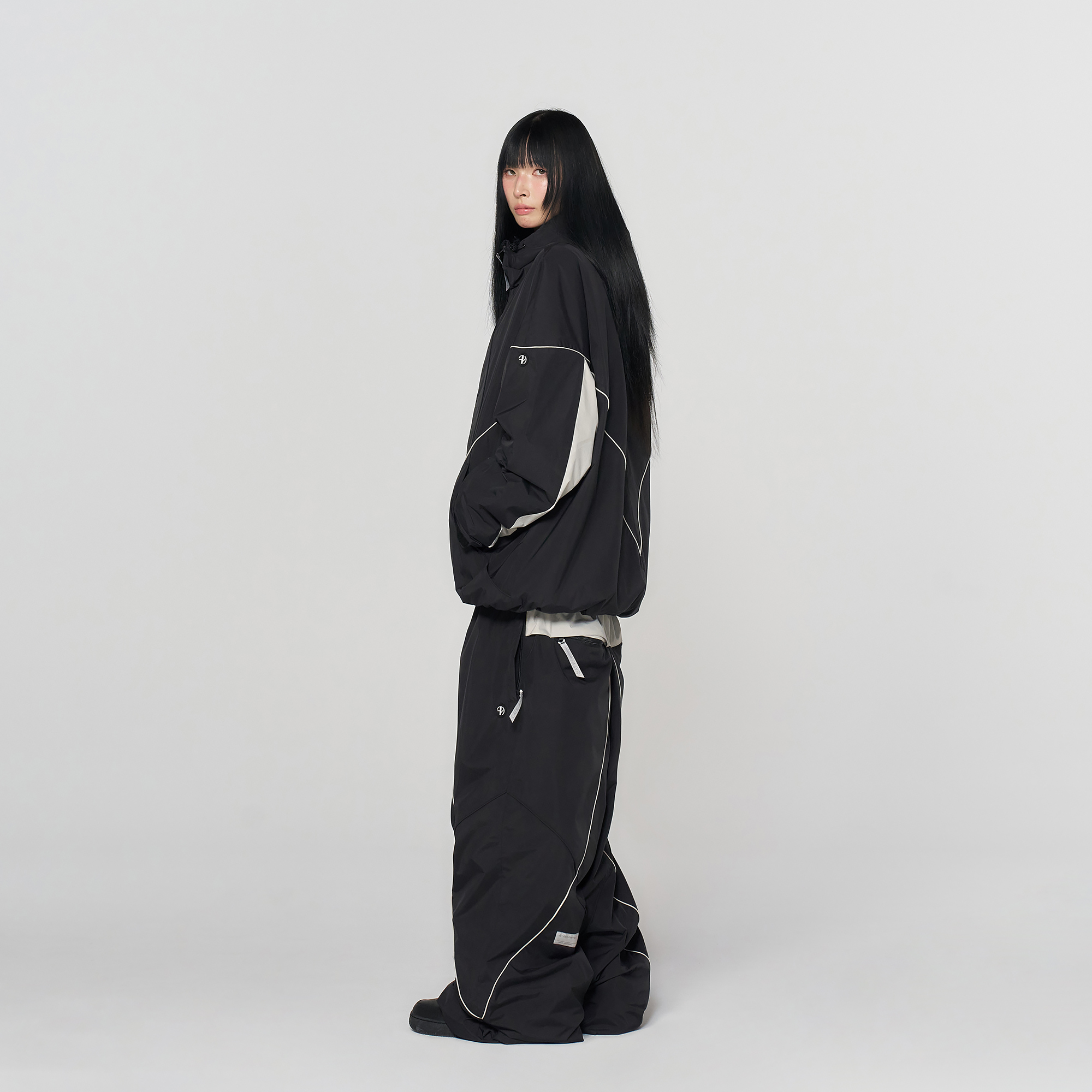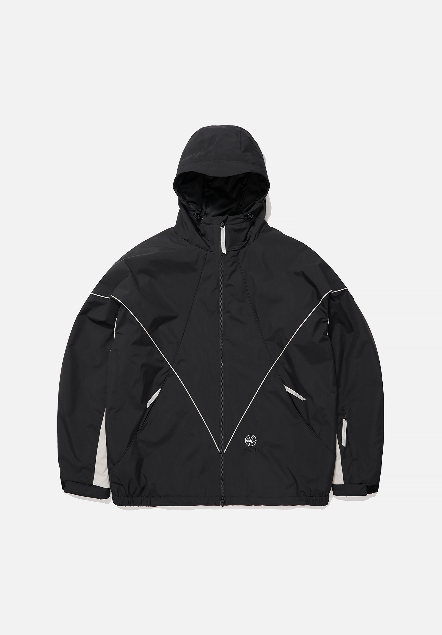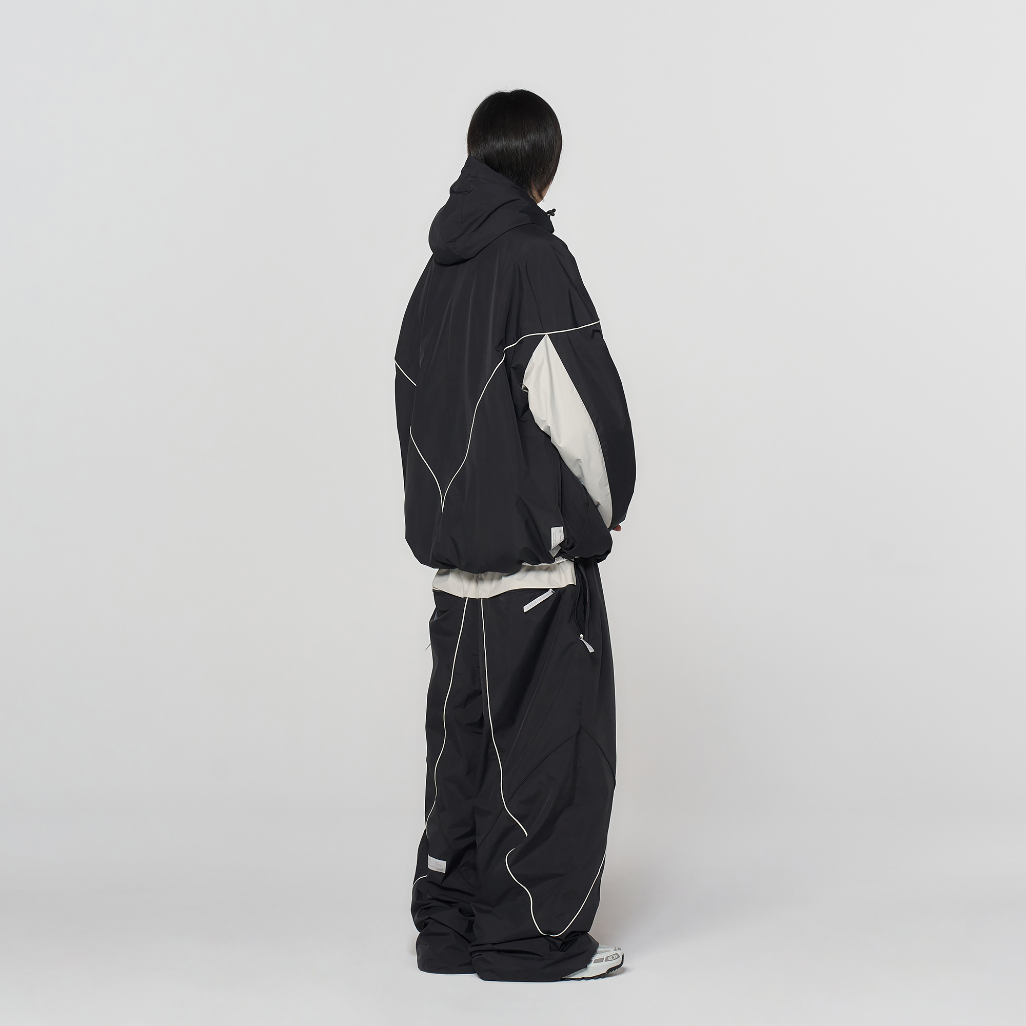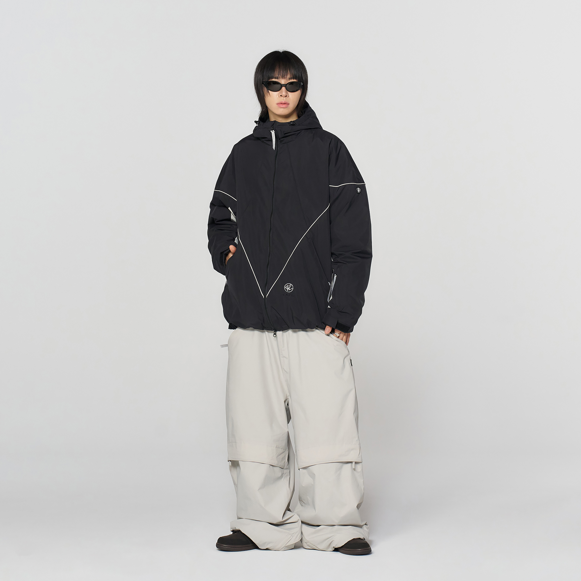 오버핏 실루엣 위에 교차된 파이핑 디테일과 소매 배색이 조화를 이루는 자켓입니다.