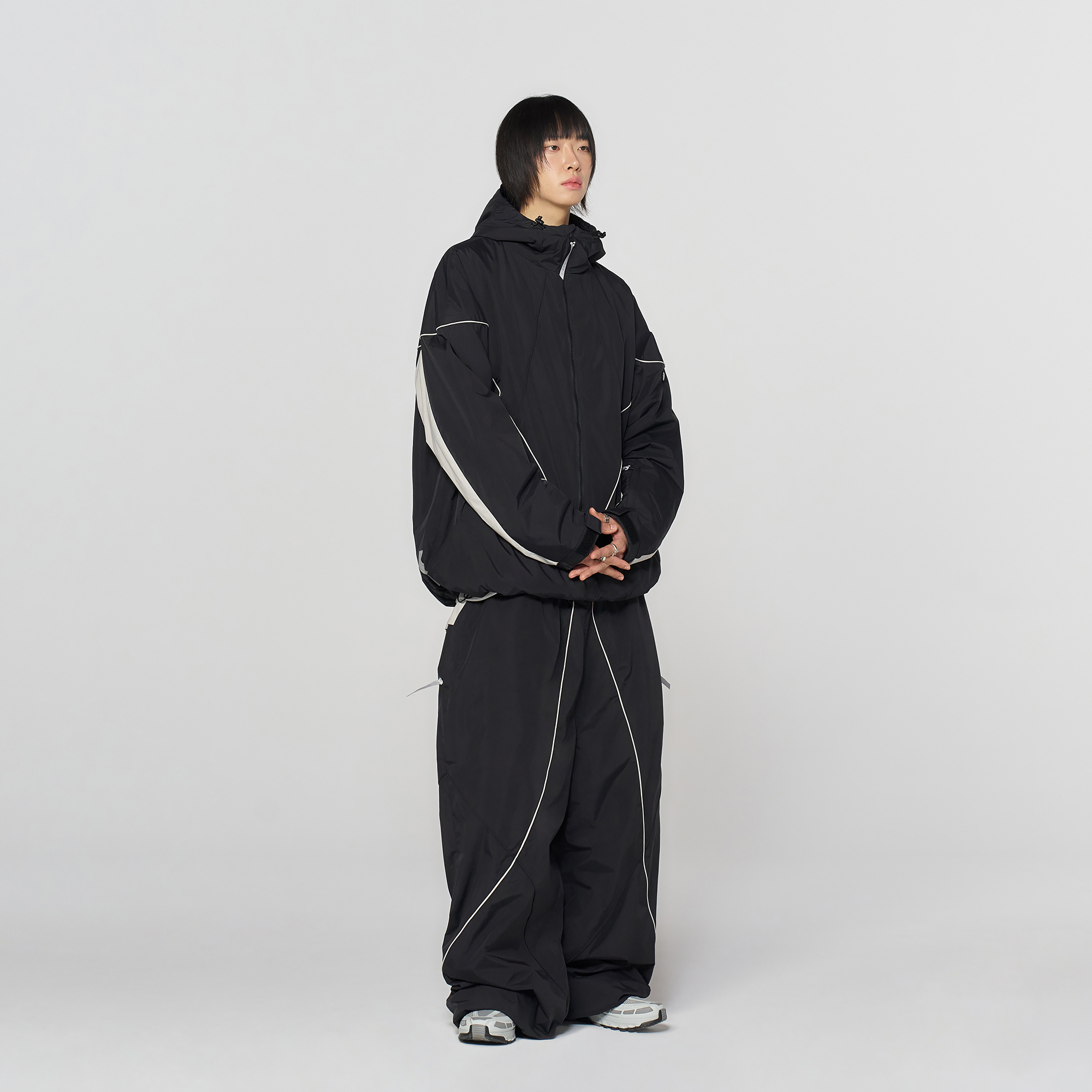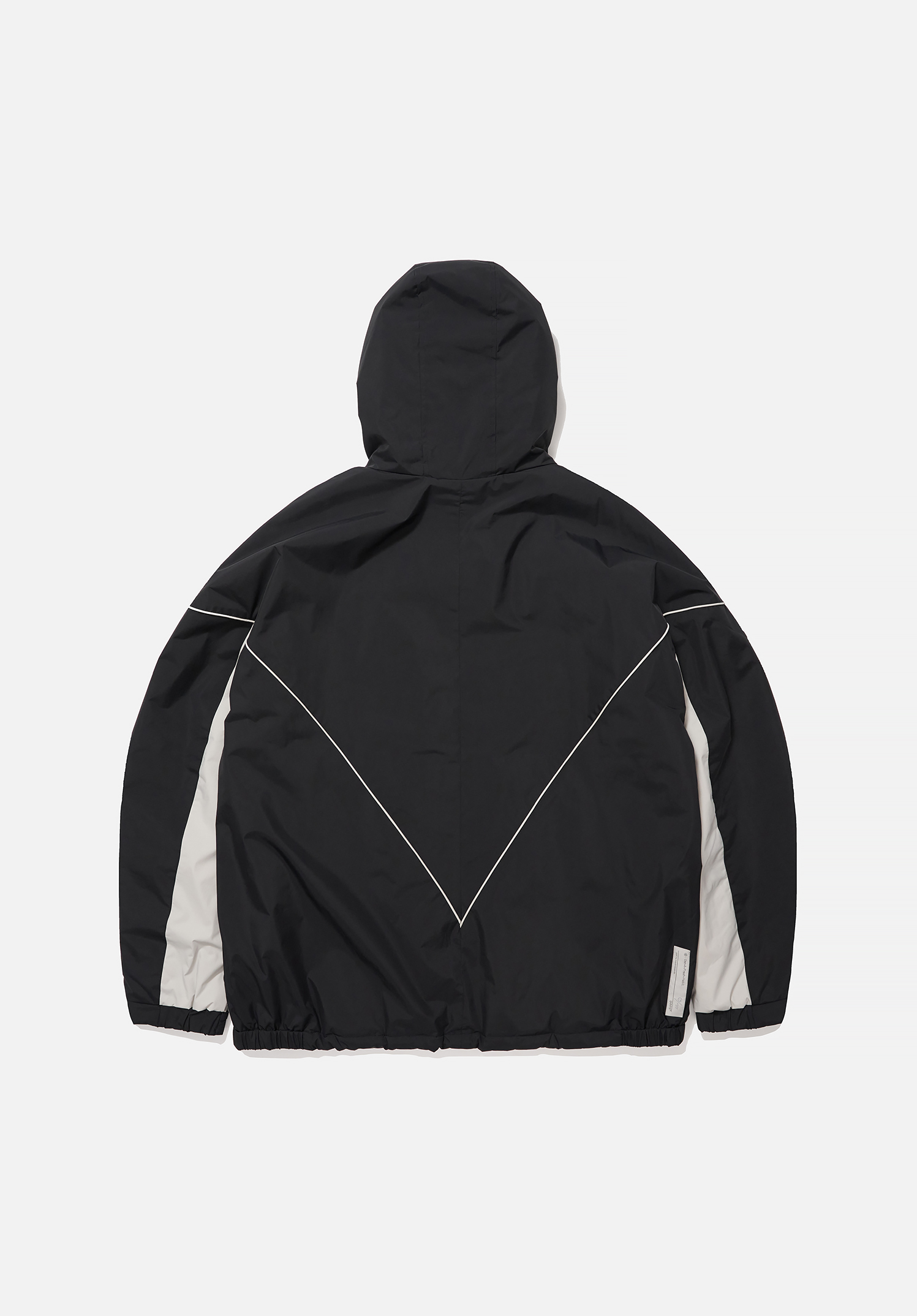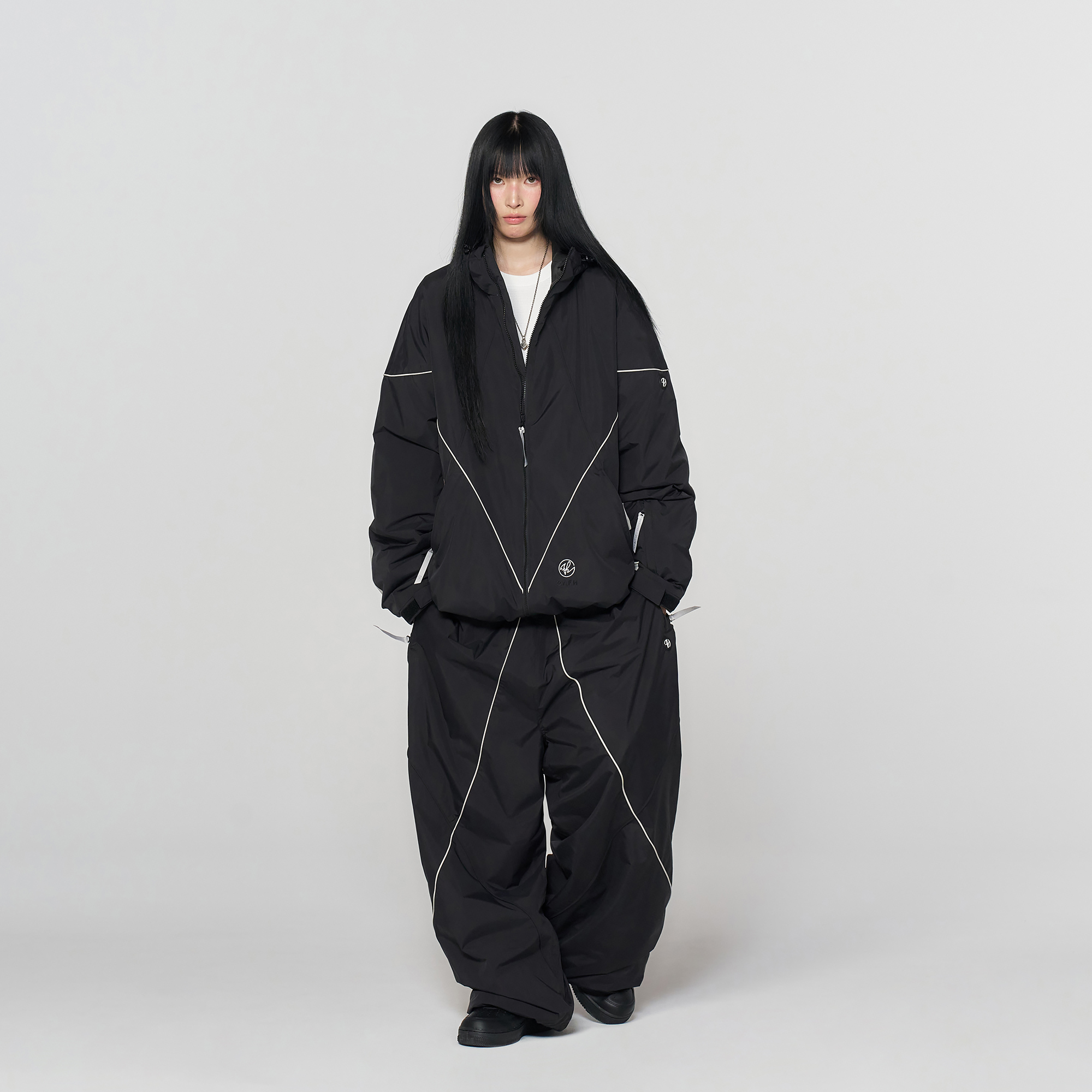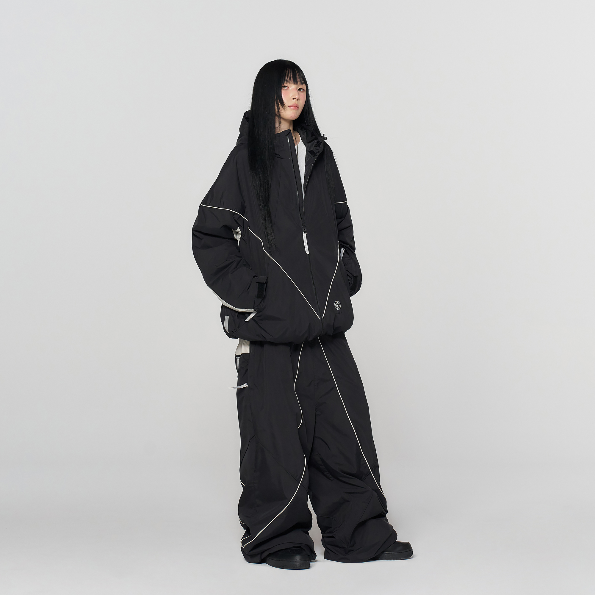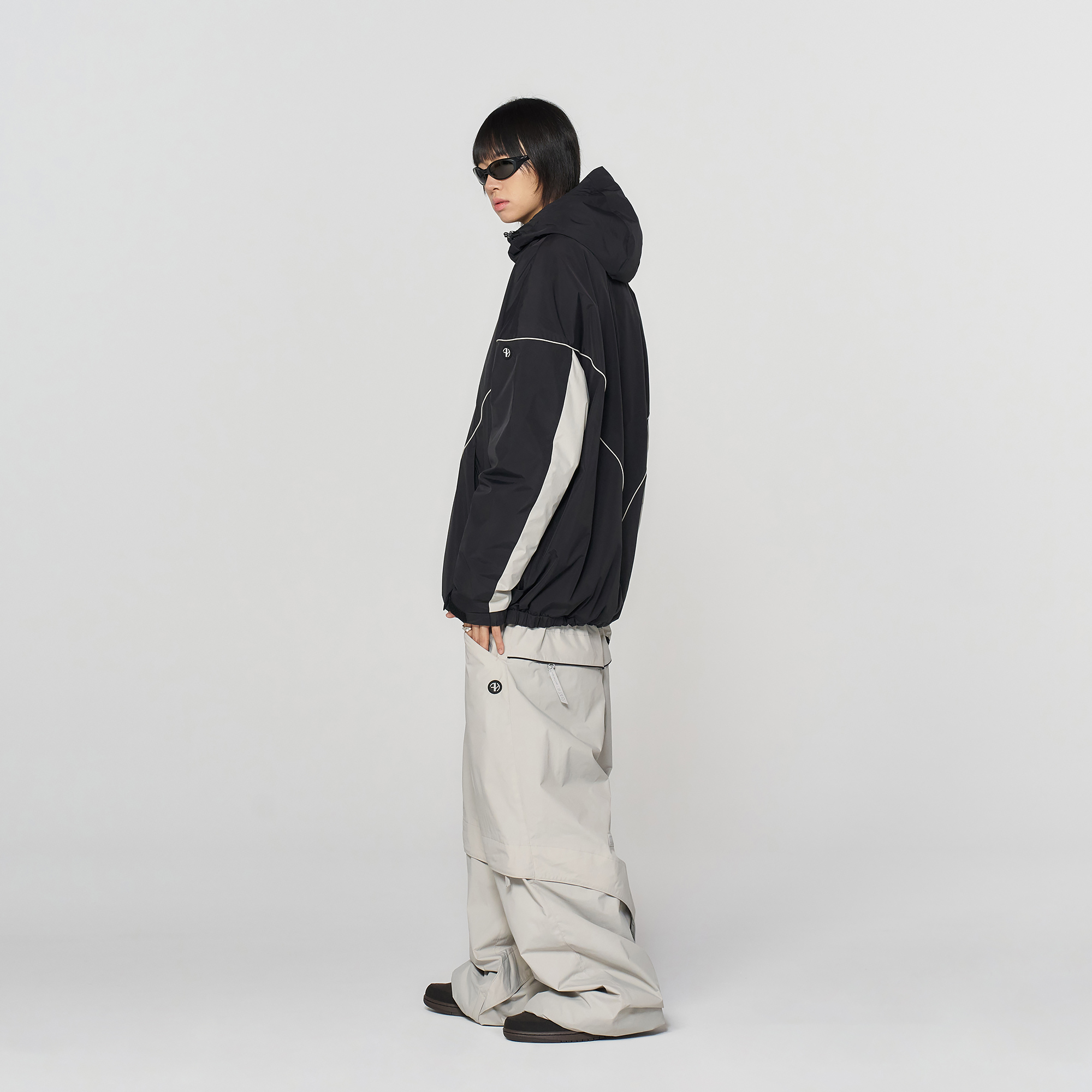오버핏 실루엣 위에 교차된 파이핑 디테일과 소매 배색이 조화를 이루는 자켓입니다.
