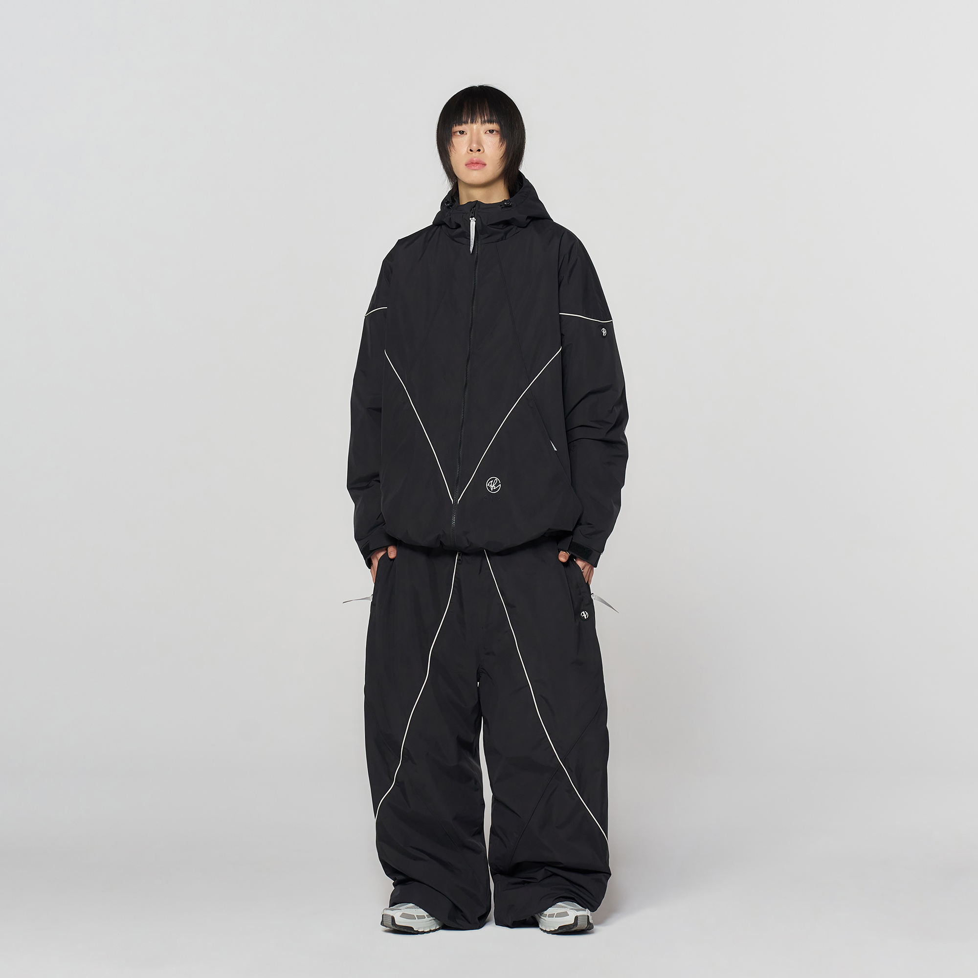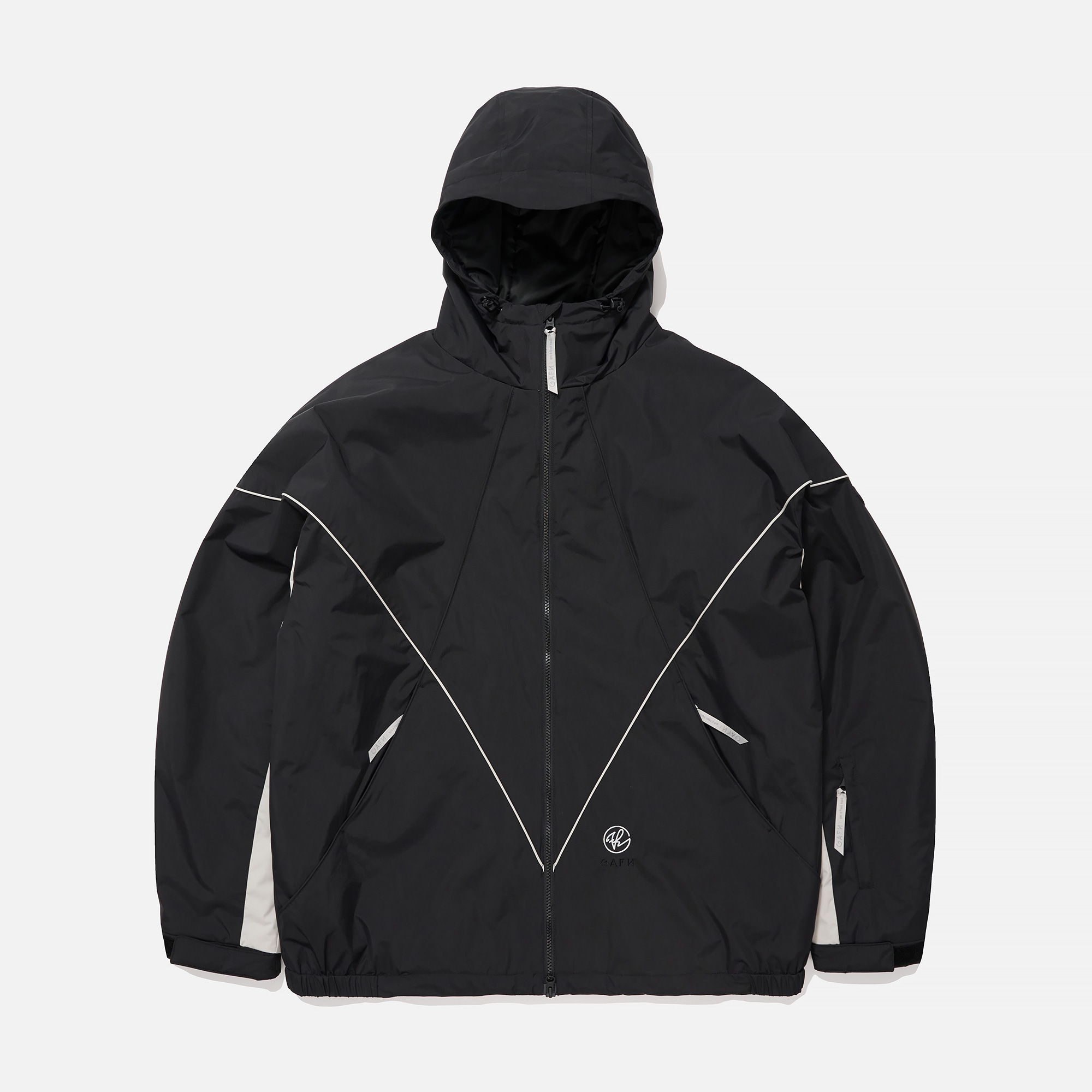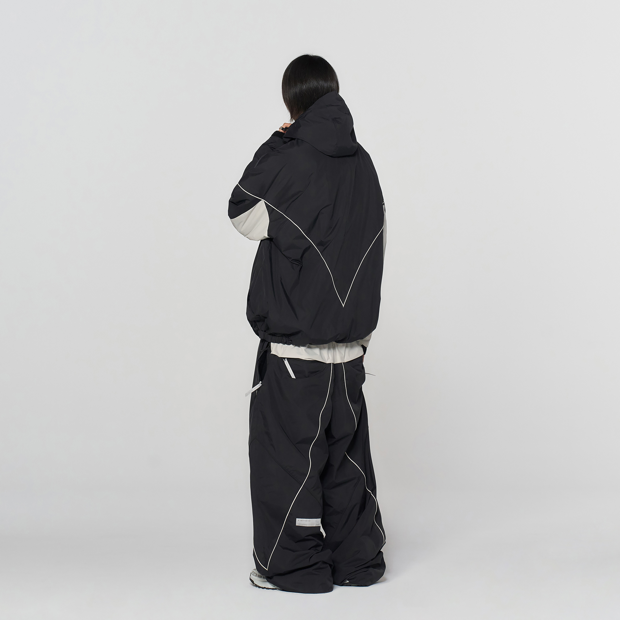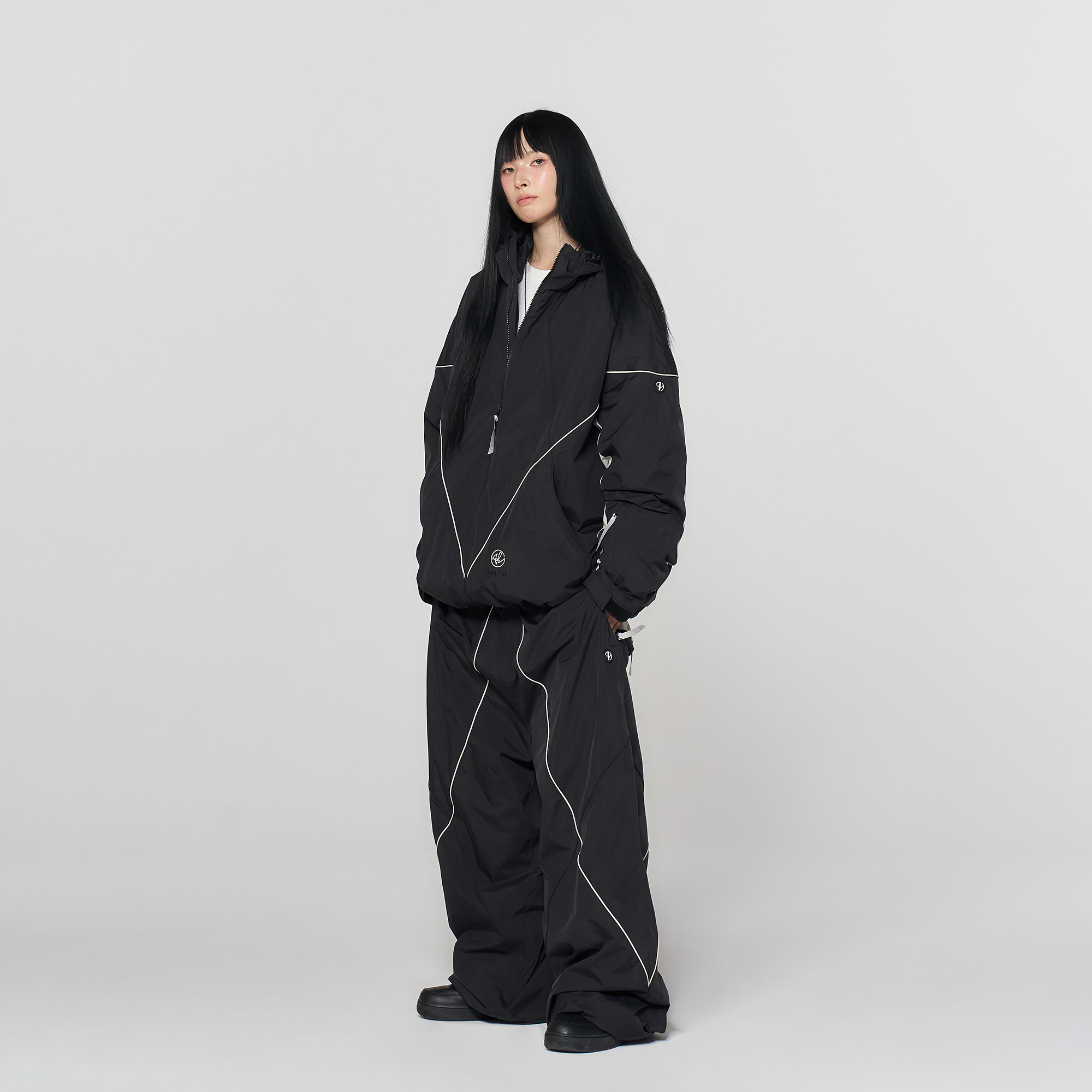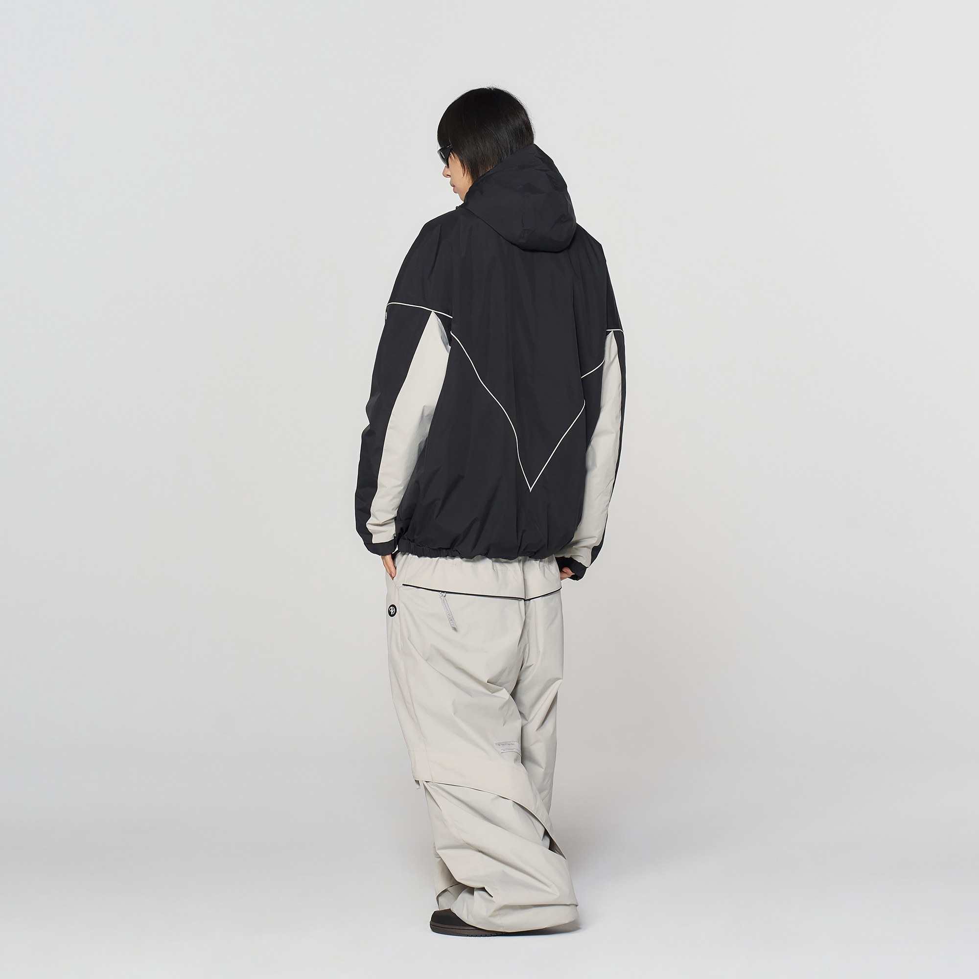 오버핏 실루엣 위에 교차된 파이핑 디테일과 소매 배색이 조화를 이루는 자켓입니다.