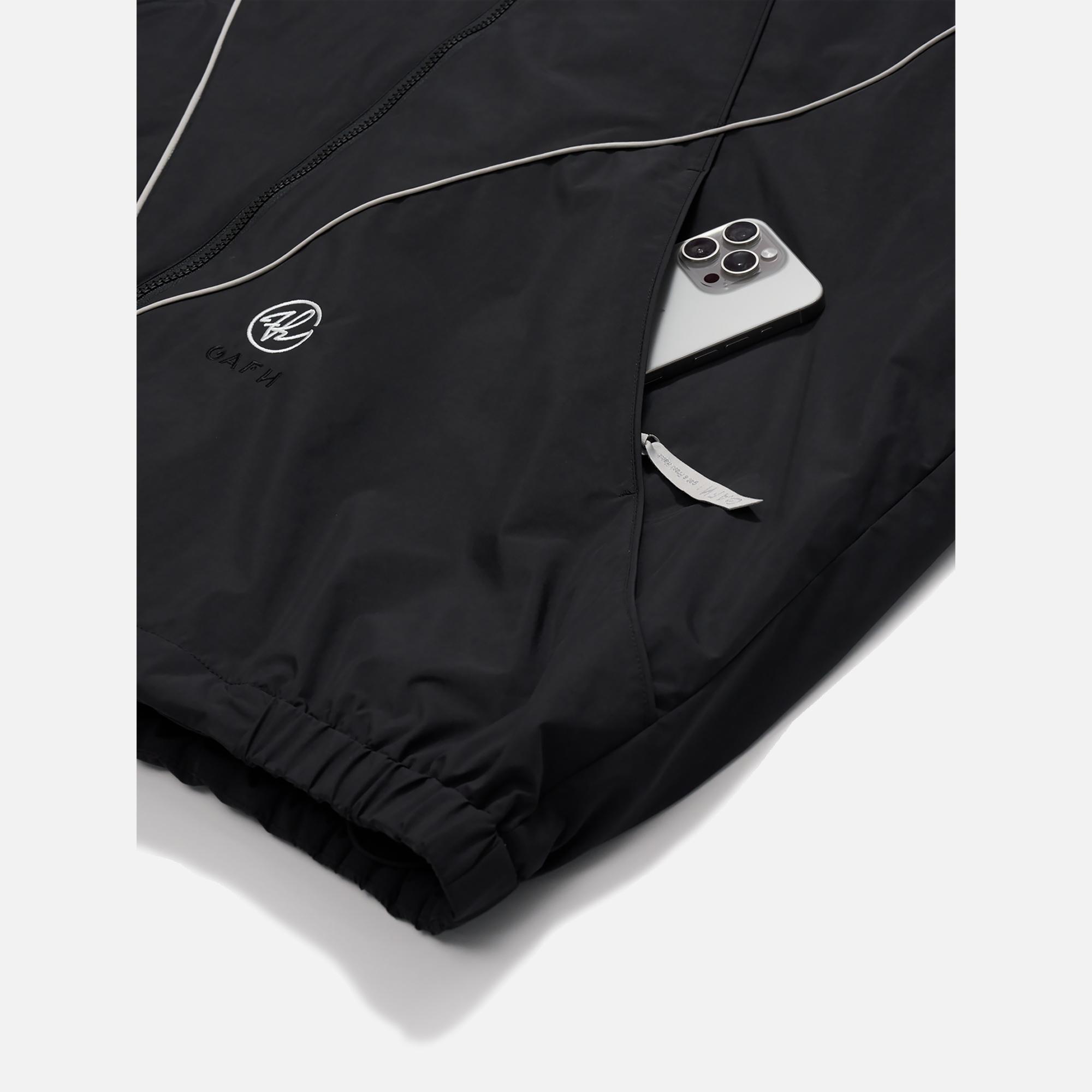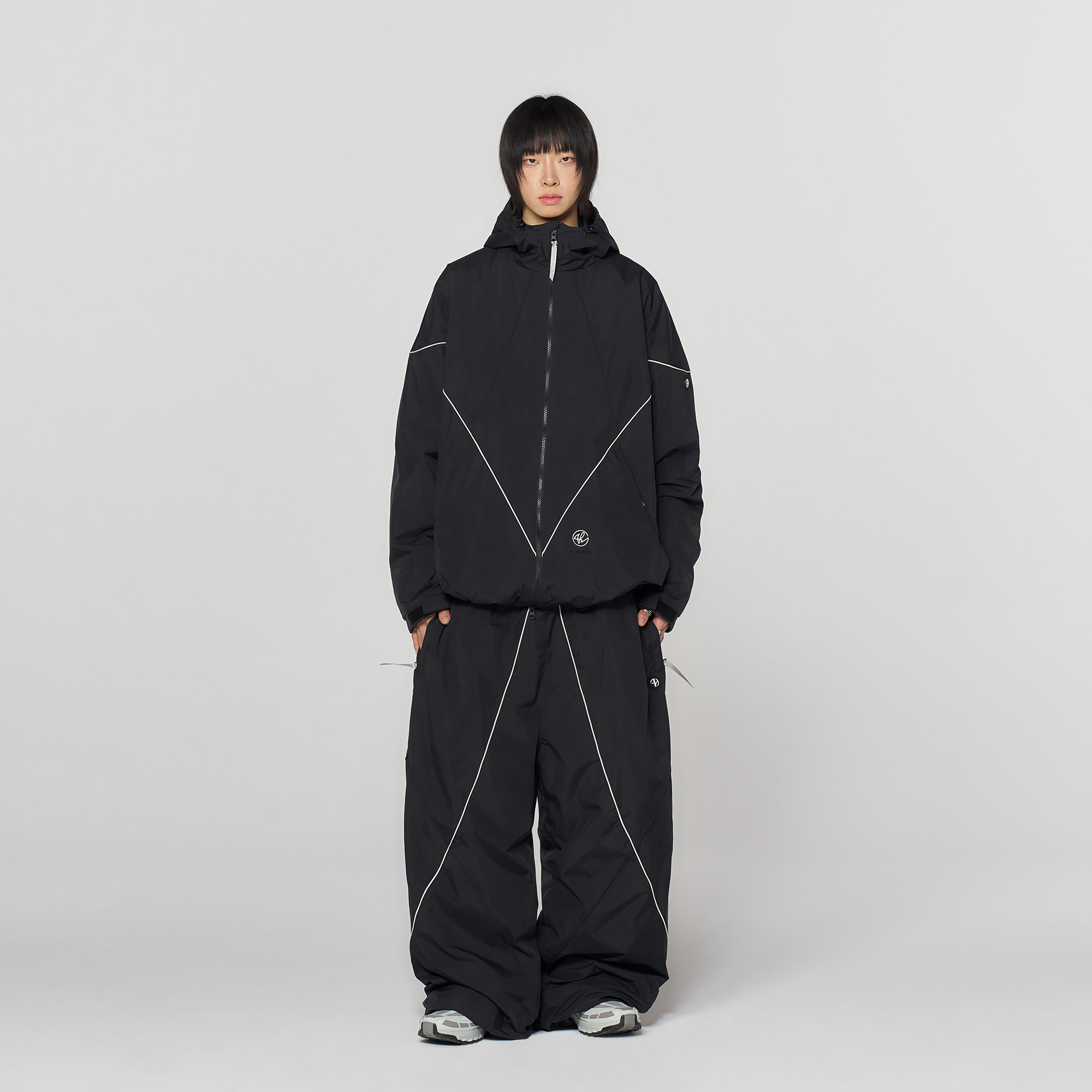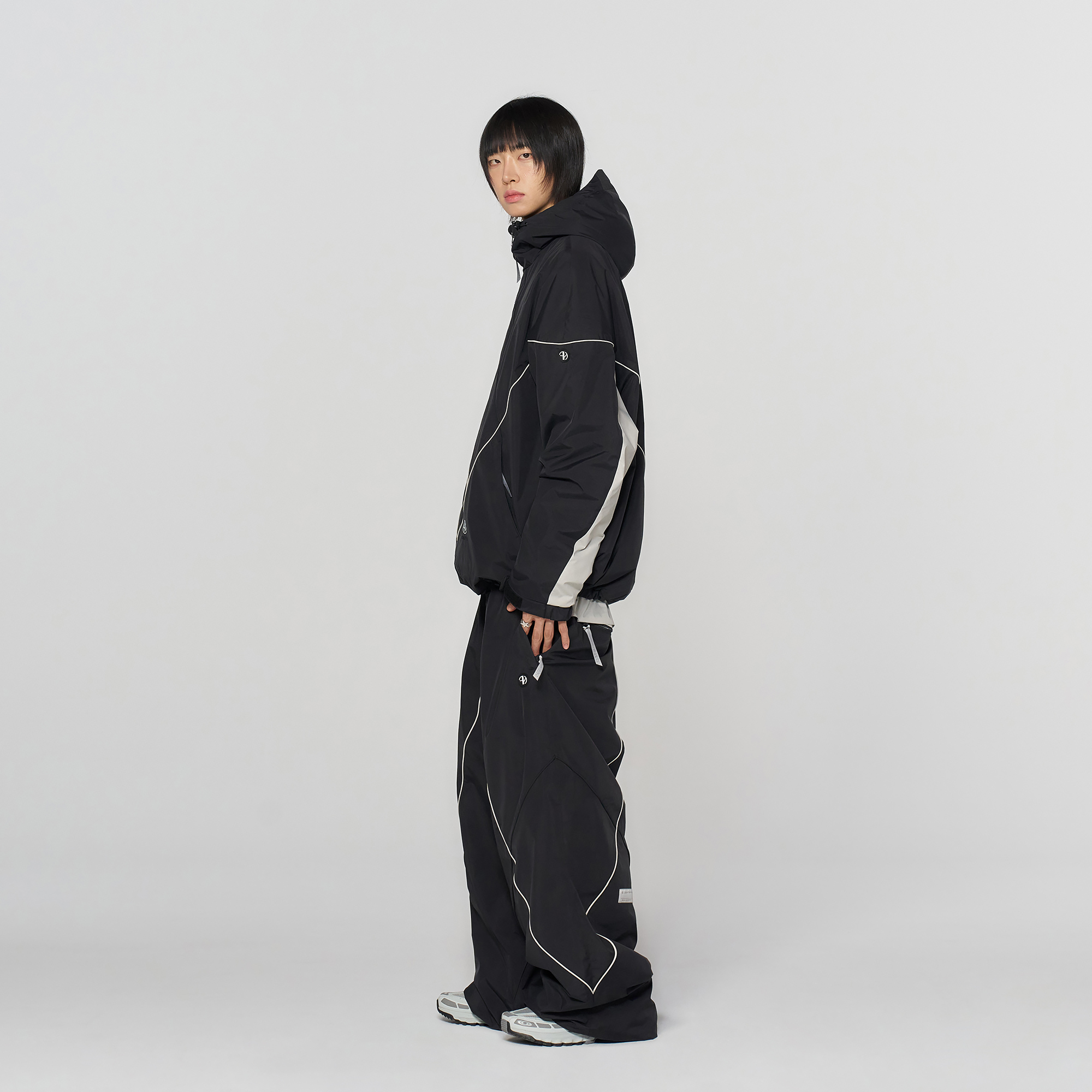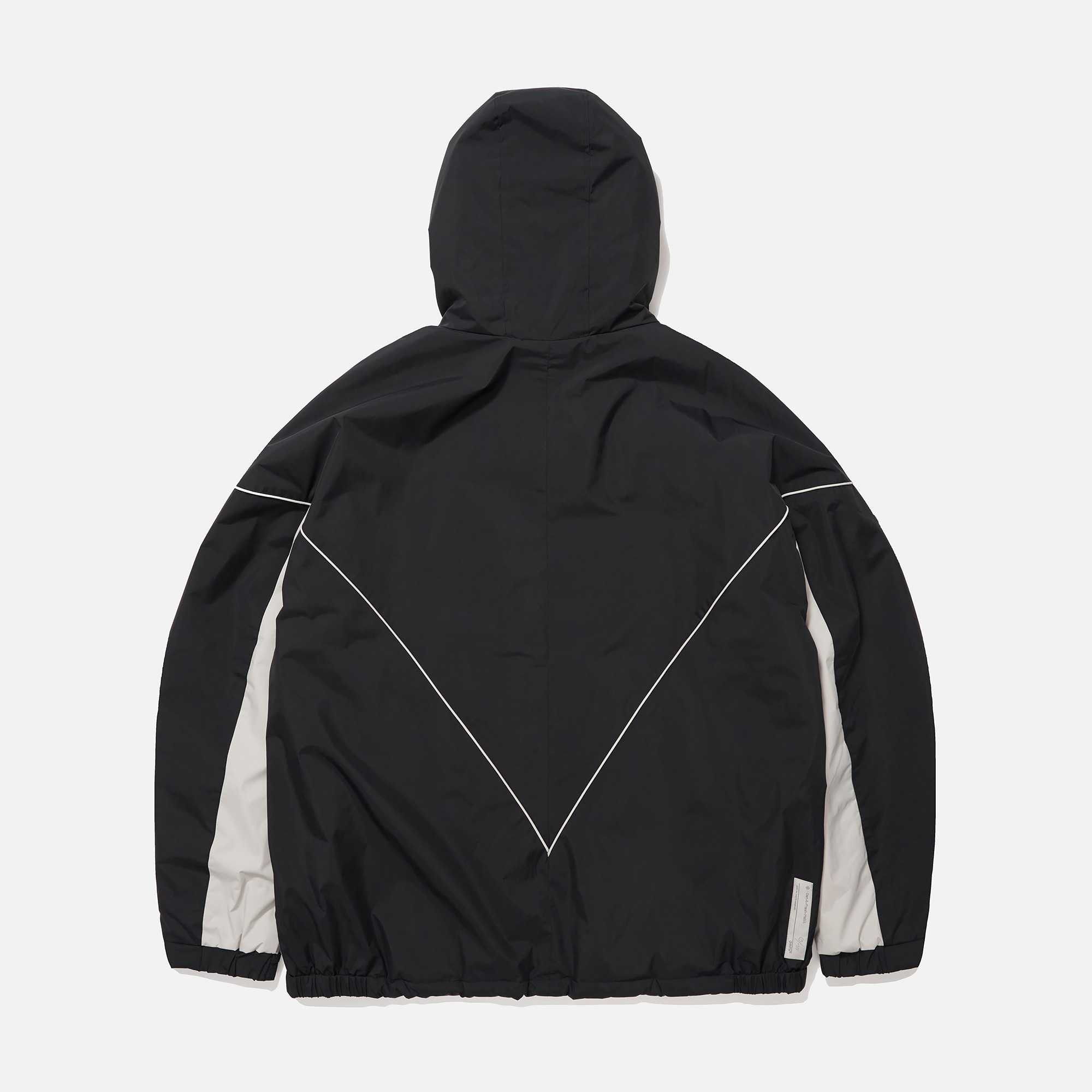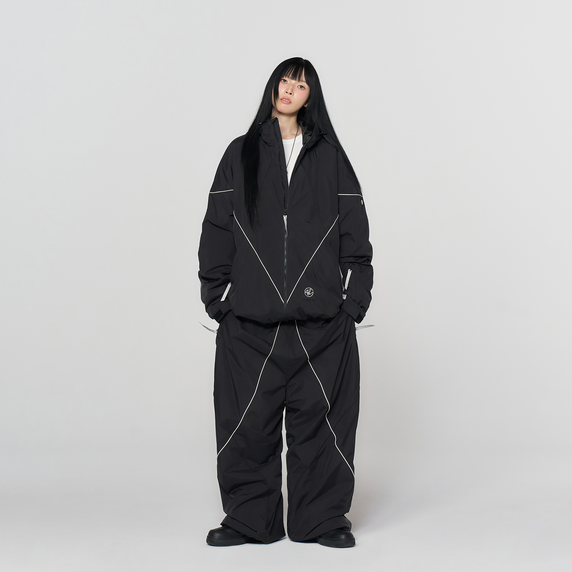 오버핏 실루엣 위에 교차된 파이핑 디테일과 소매 배색이 조화를 이루는 자켓입니다.