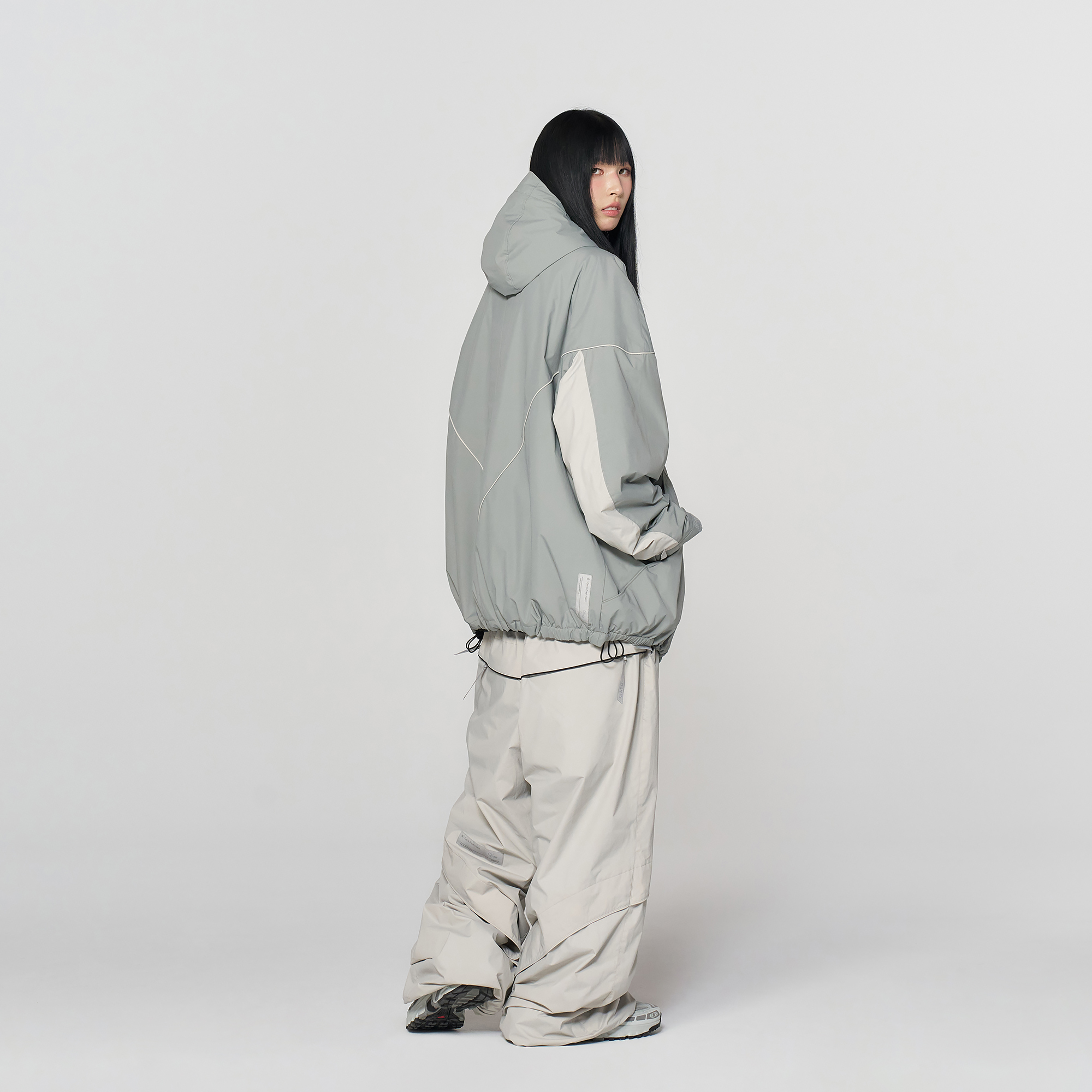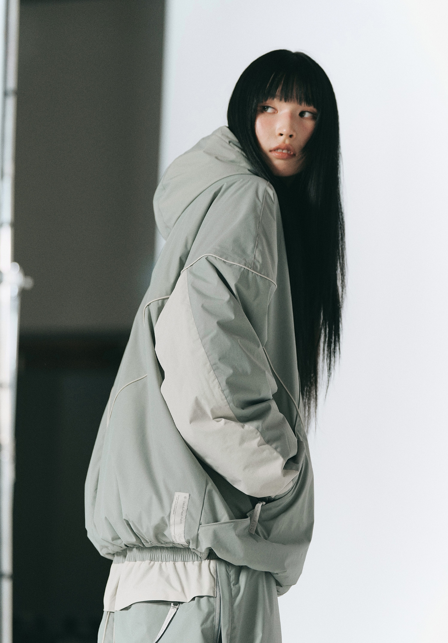 오버핏 실루엣 위에 교차된 파이핑 디테일과 소매 배색이 조화를 이루는 자켓입니다.