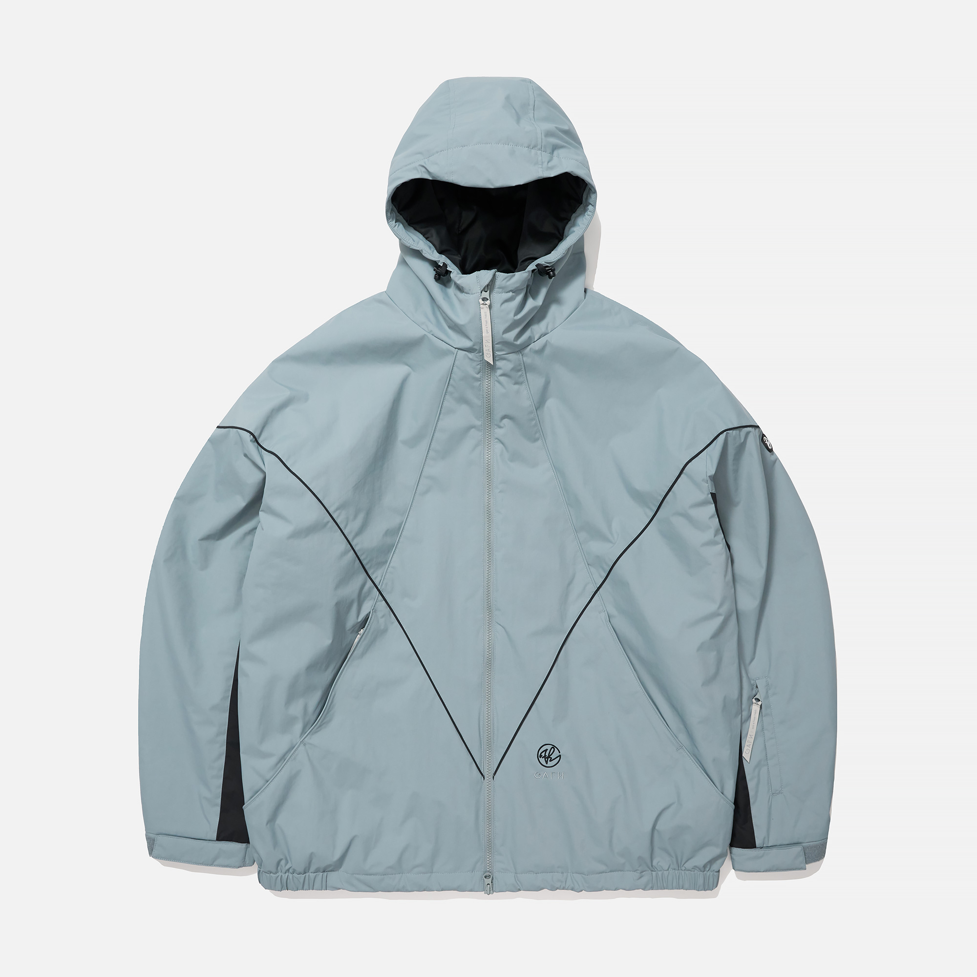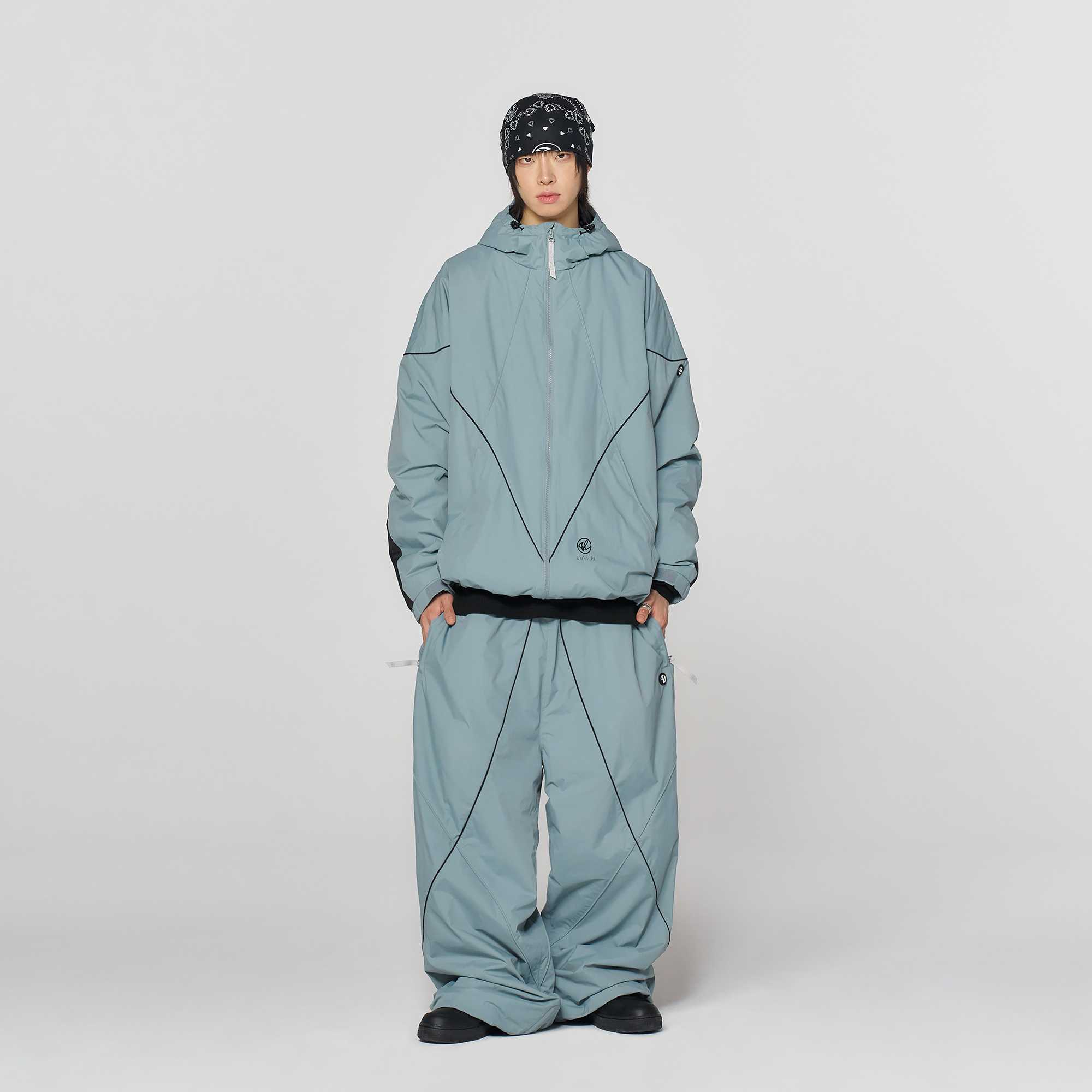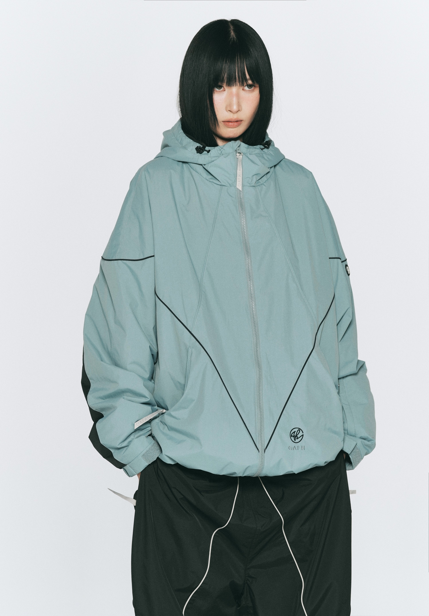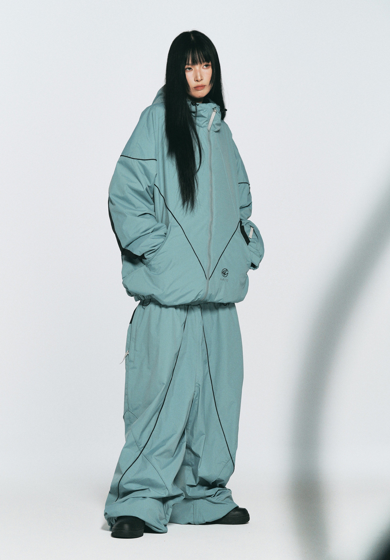 오버핏 실루엣 위에 교차된 파이핑 디테일과 소매 배색이 조화를 이루는 자켓입니다.
