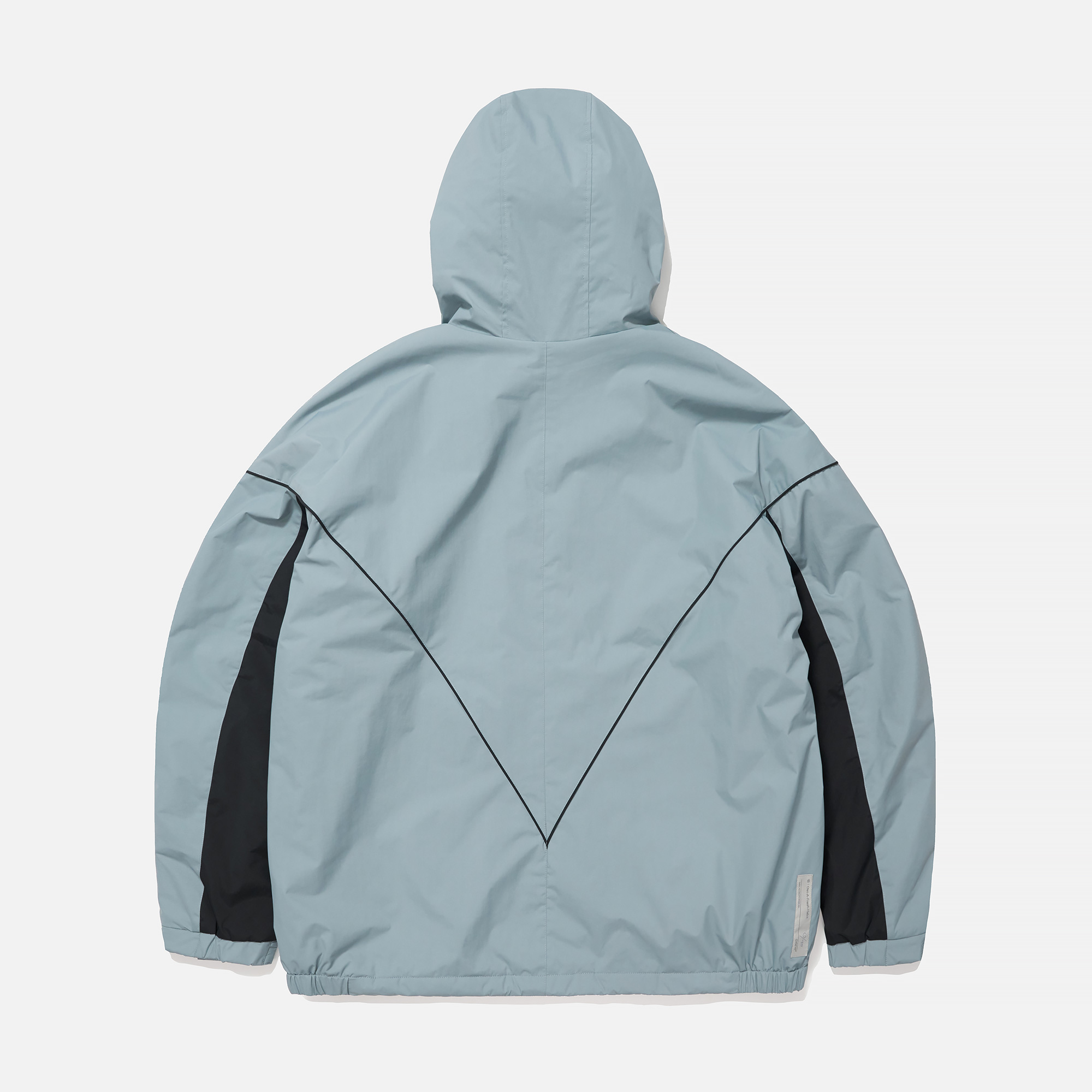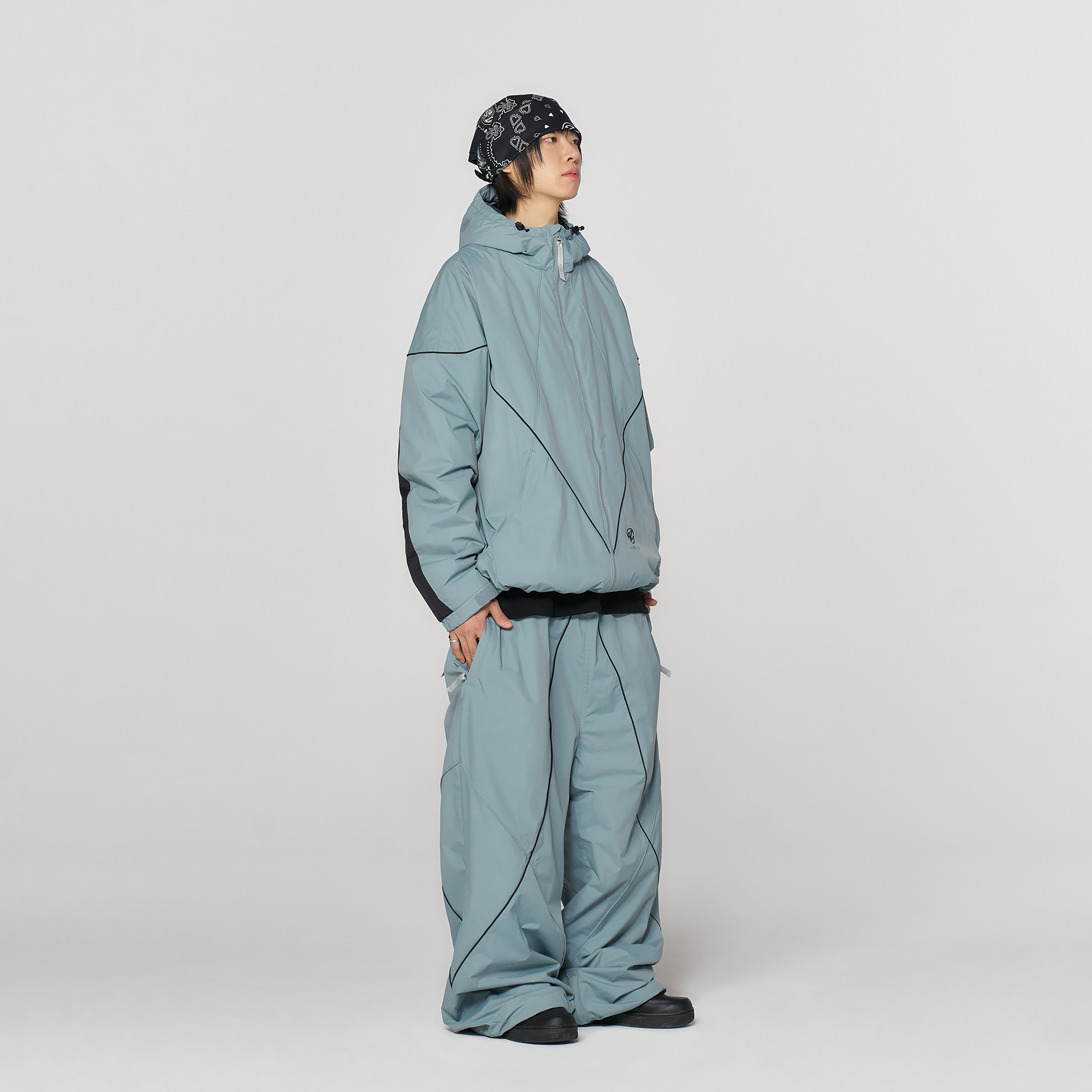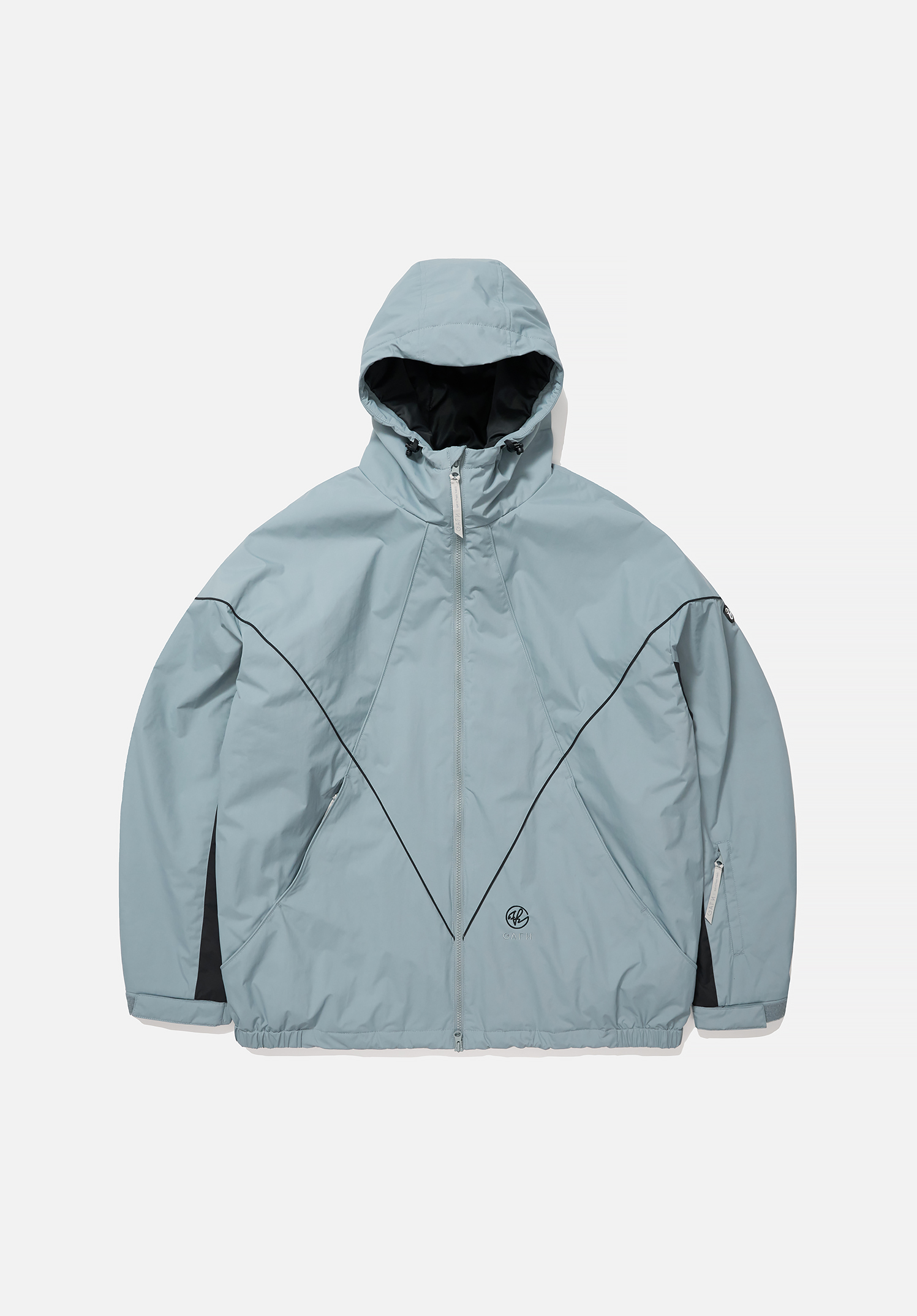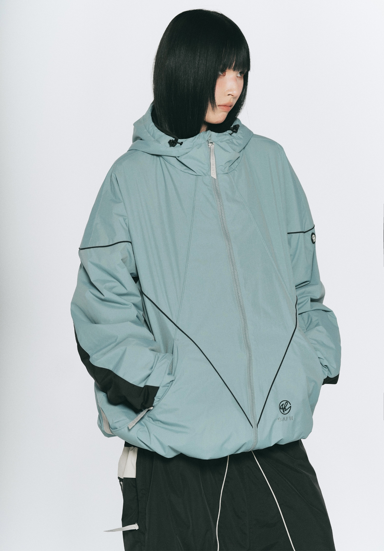 오버핏 실루엣 위에 교차된 파이핑 디테일과 소매 배색이 조화를 이루는 자켓입니다.