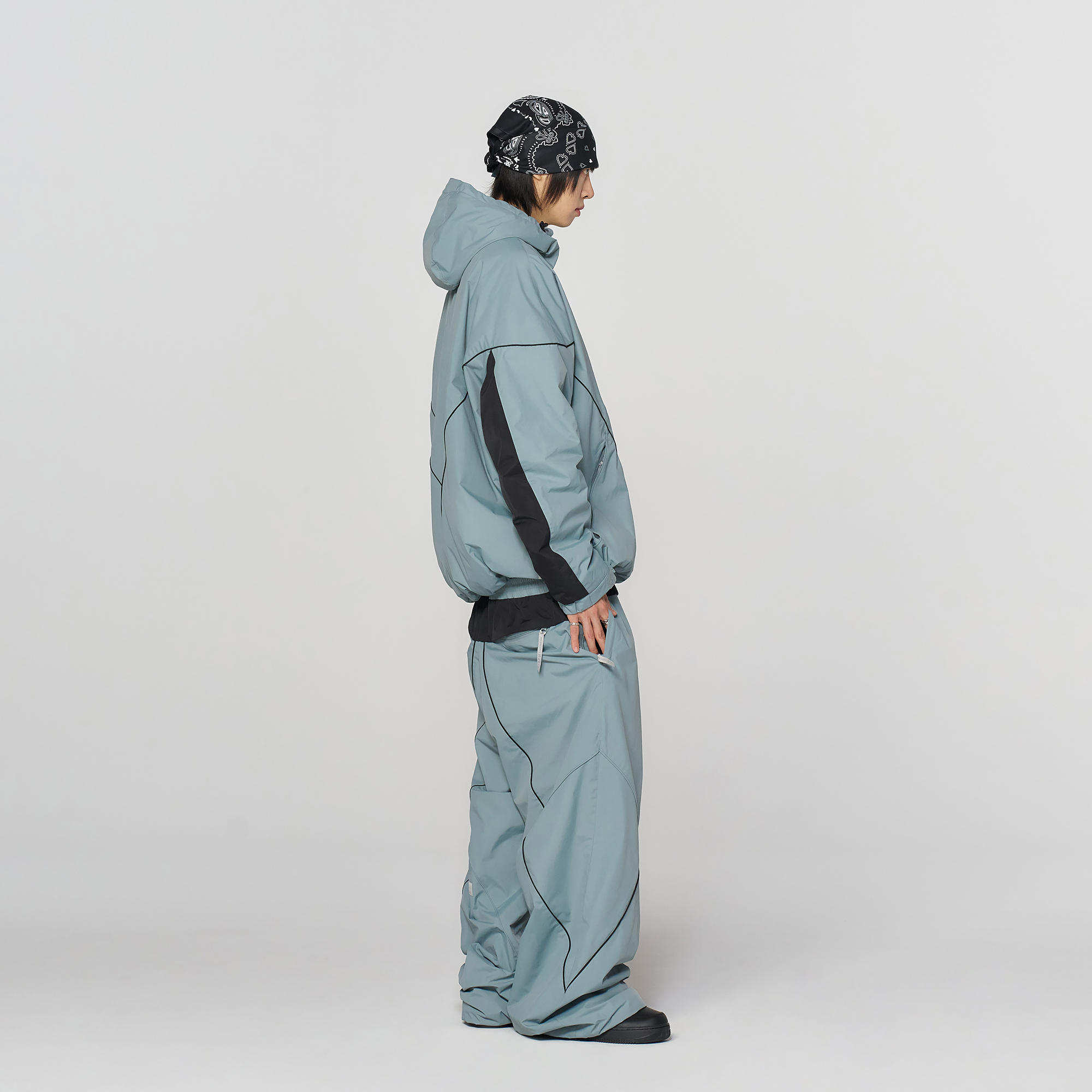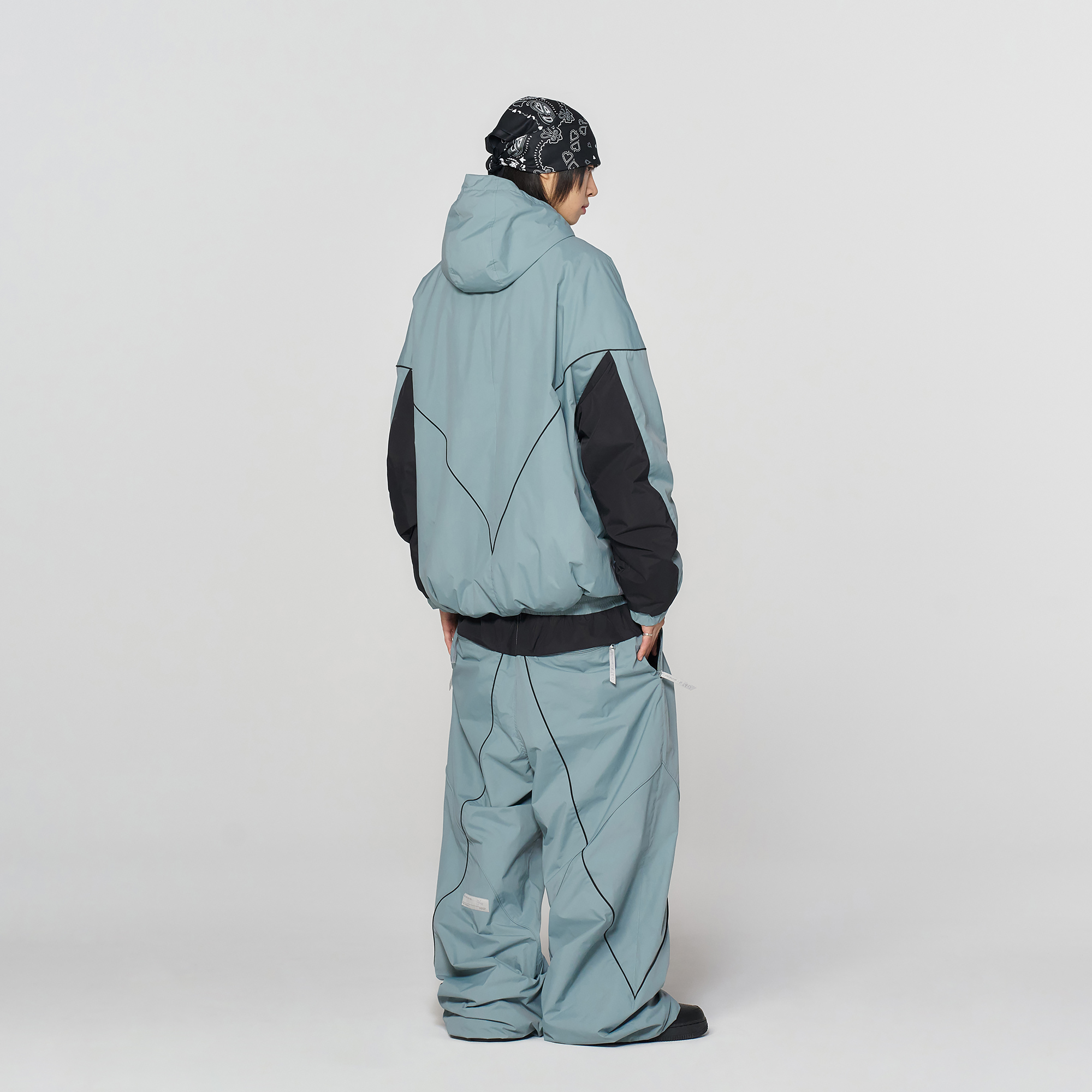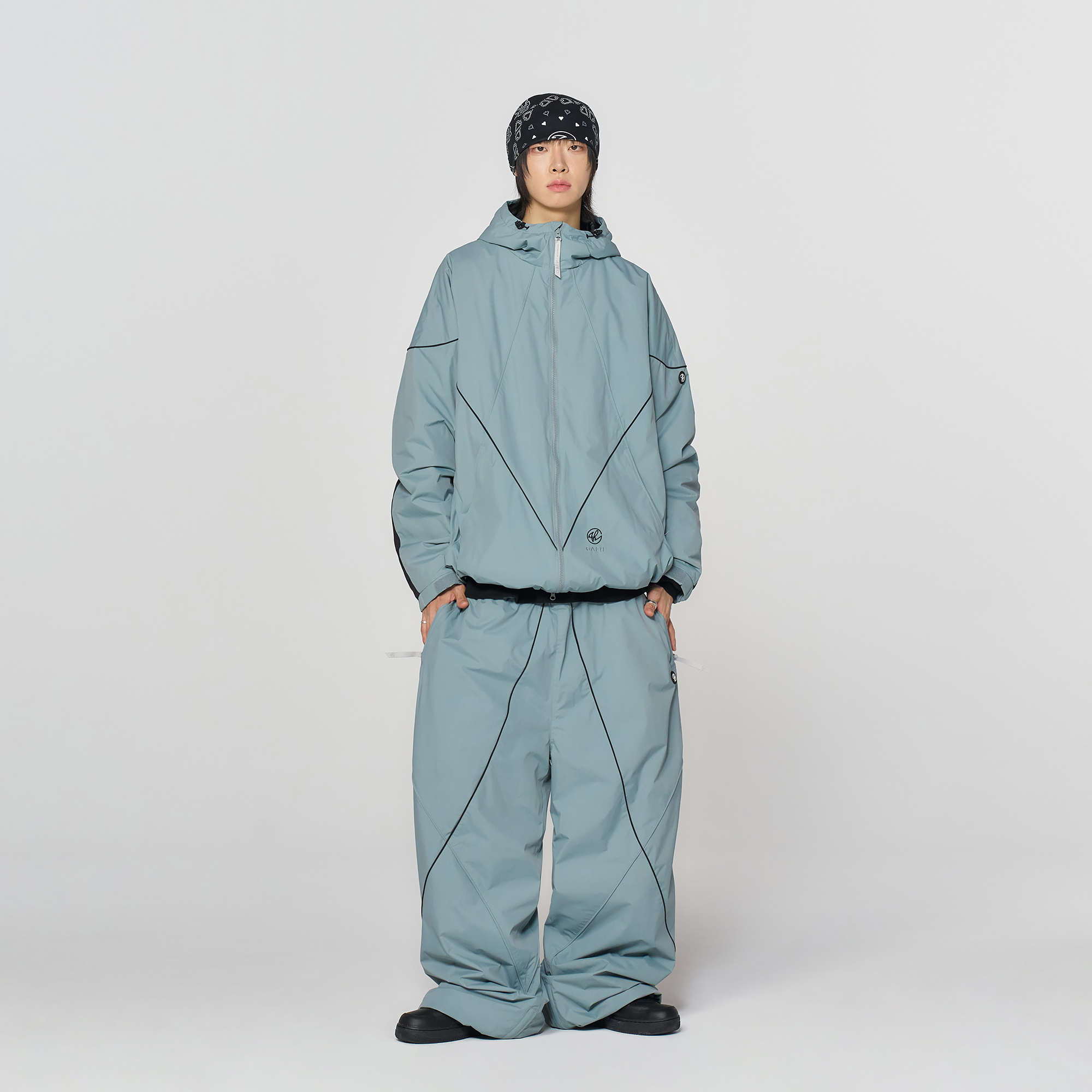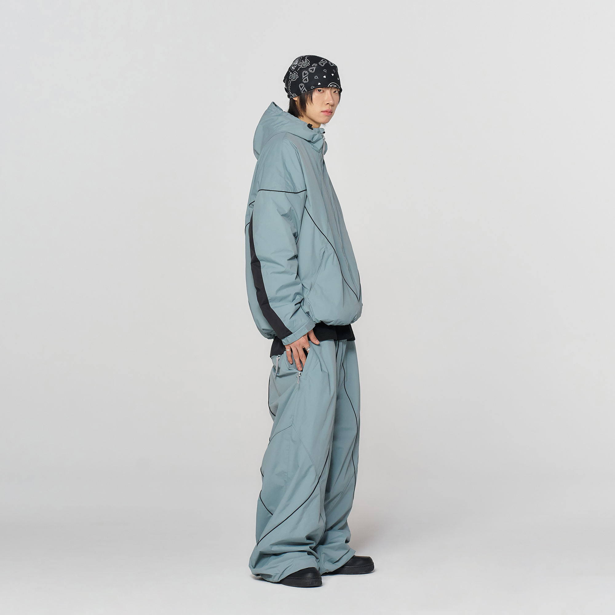 오버핏 실루엣 위에 교차된 파이핑 디테일과 소매 배색이 조화를 이루는 자켓입니다.