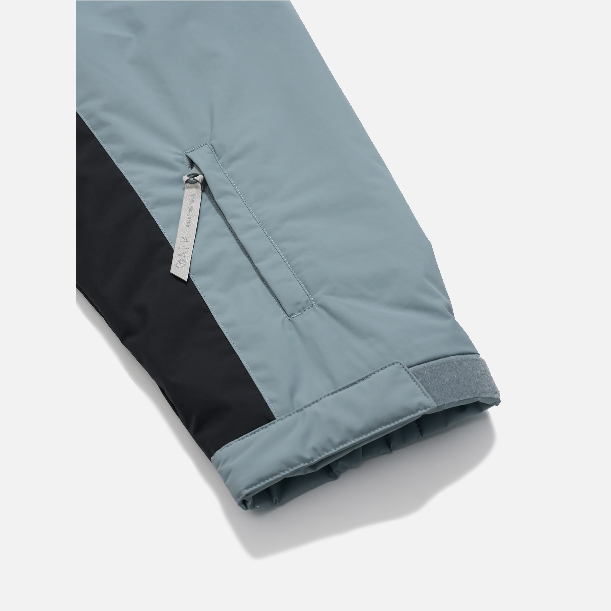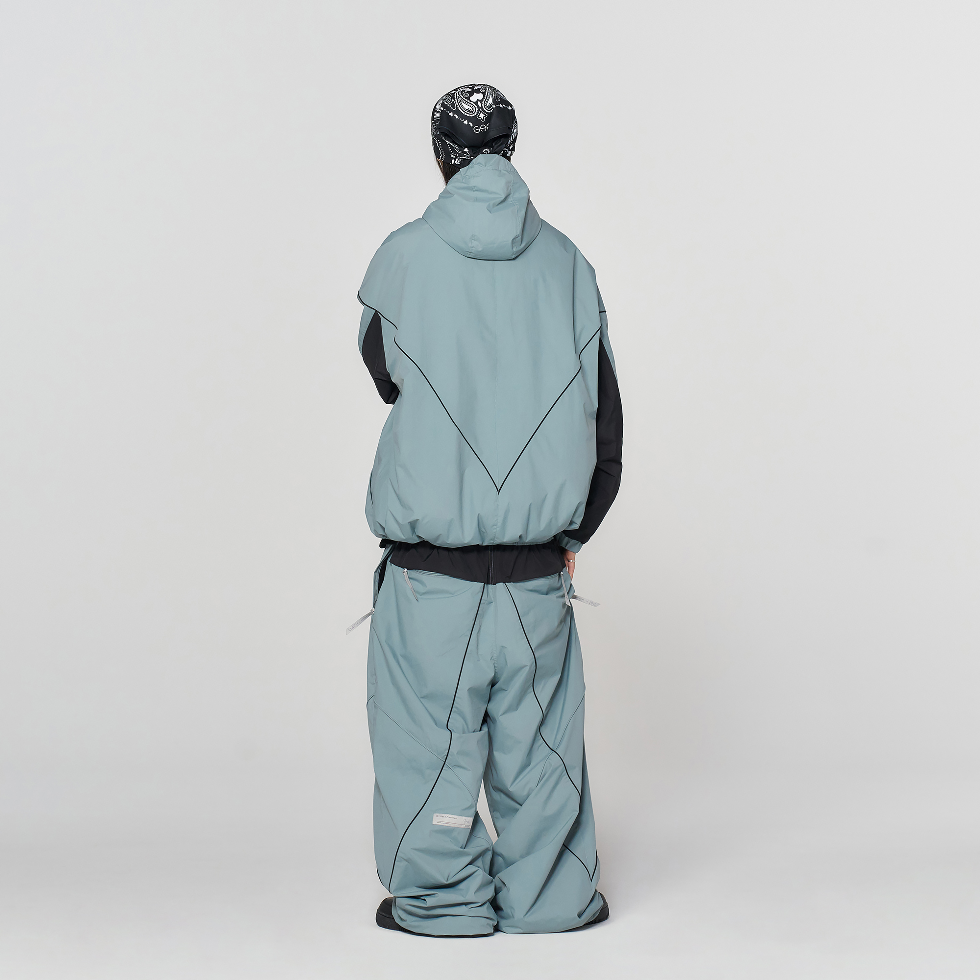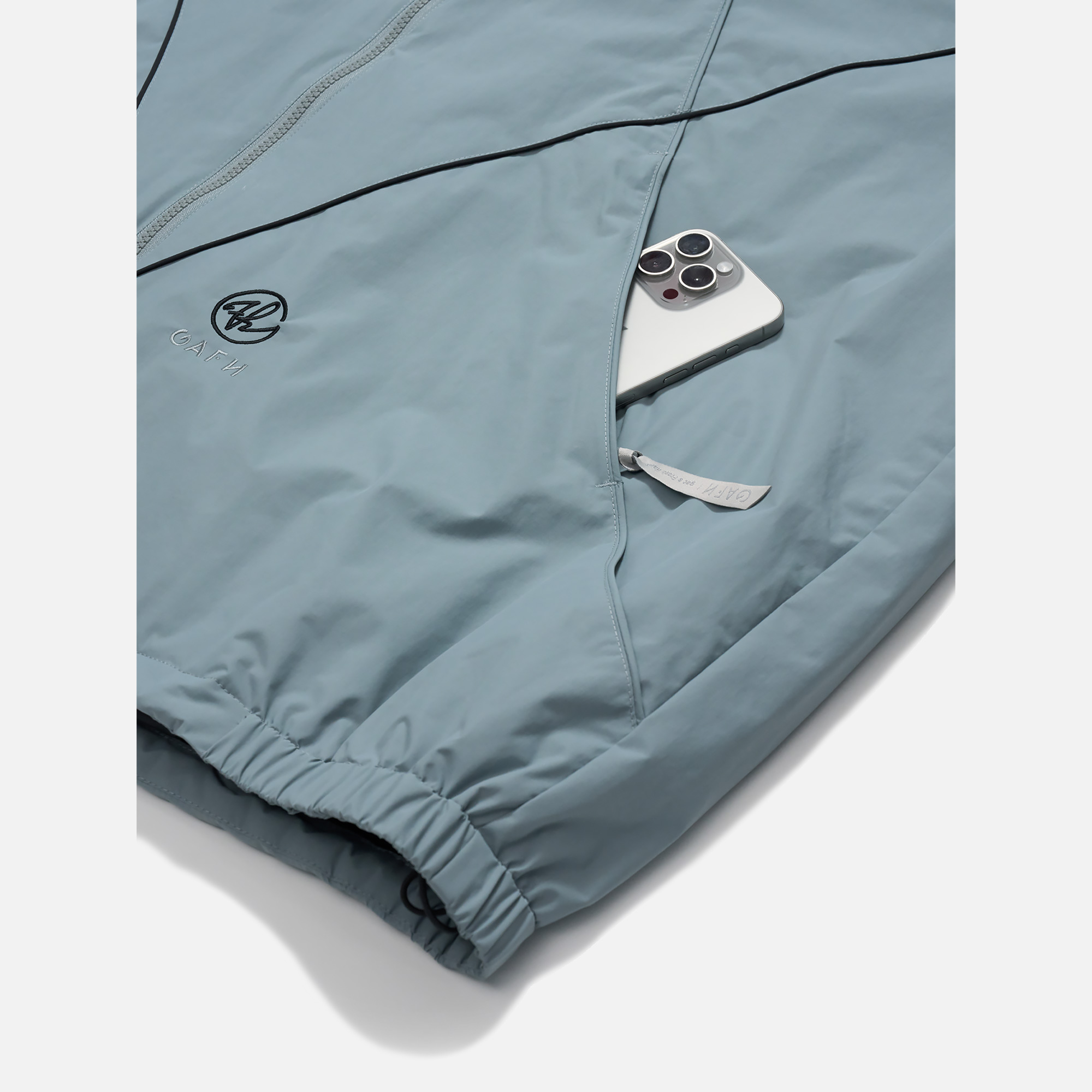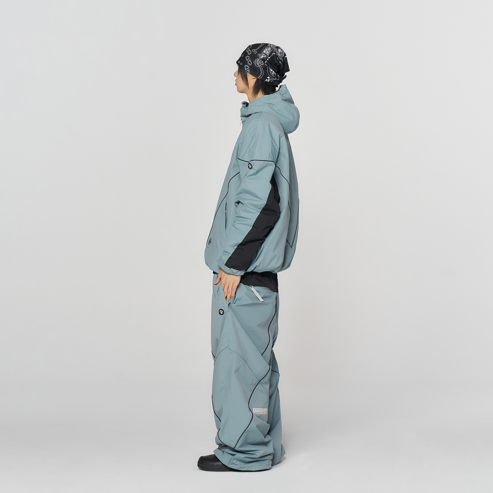 오버핏 실루엣 위에 교차된 파이핑 디테일과 소매 배색이 조화를 이루는 자켓입니다.