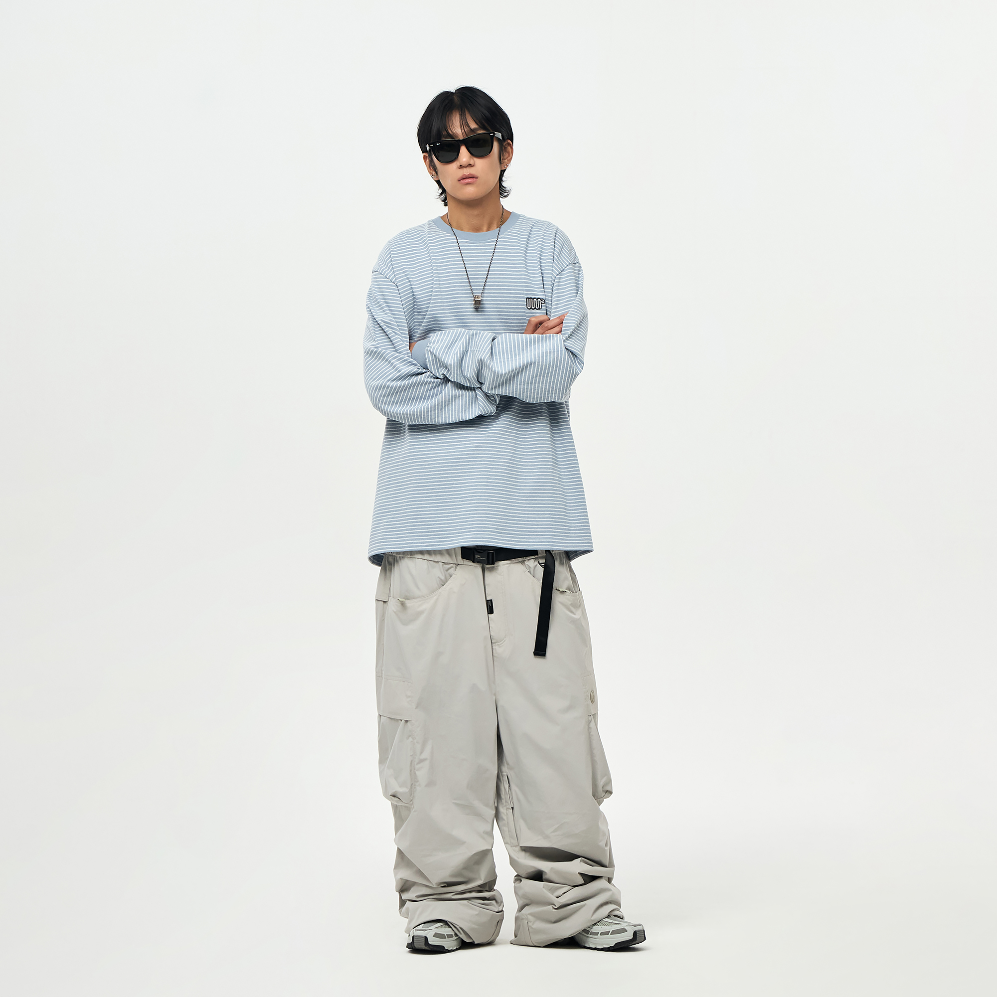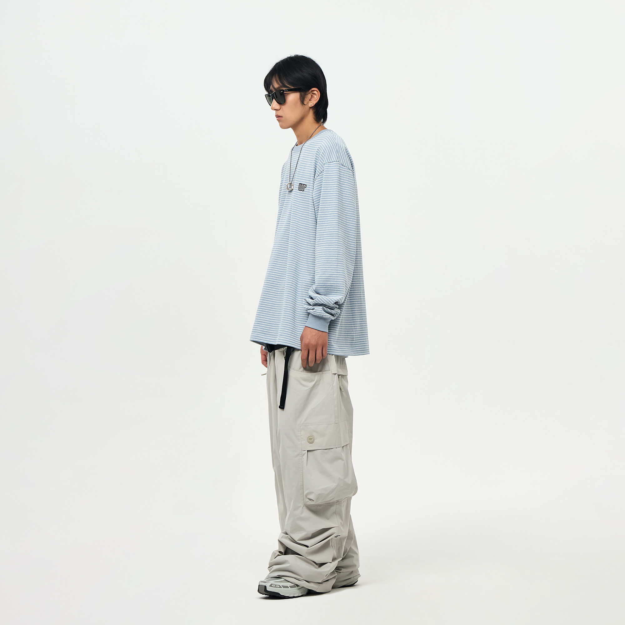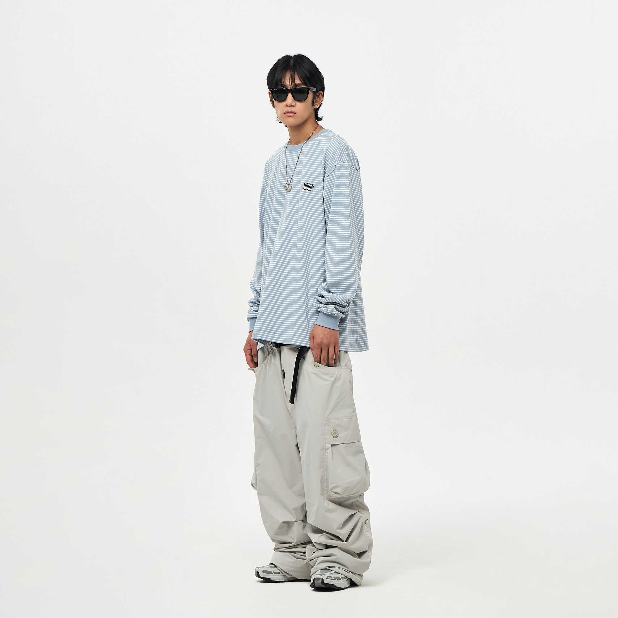 스트라이프 패턴의 여유있는 릴렉스 핏의 롱슬리브 티셔츠 제품입니다.