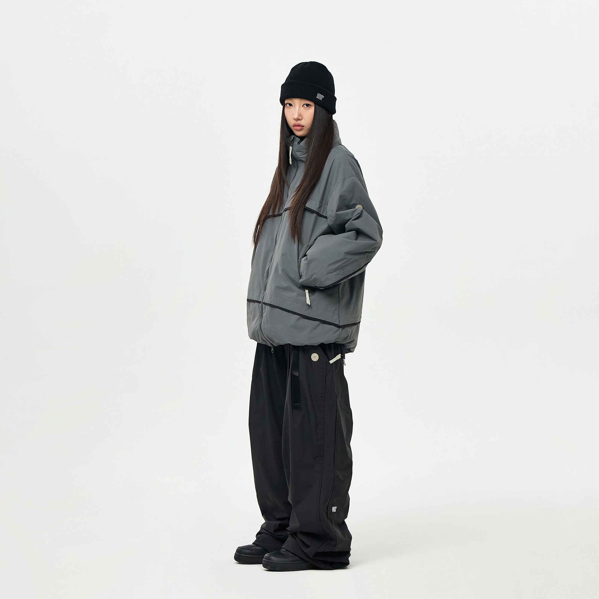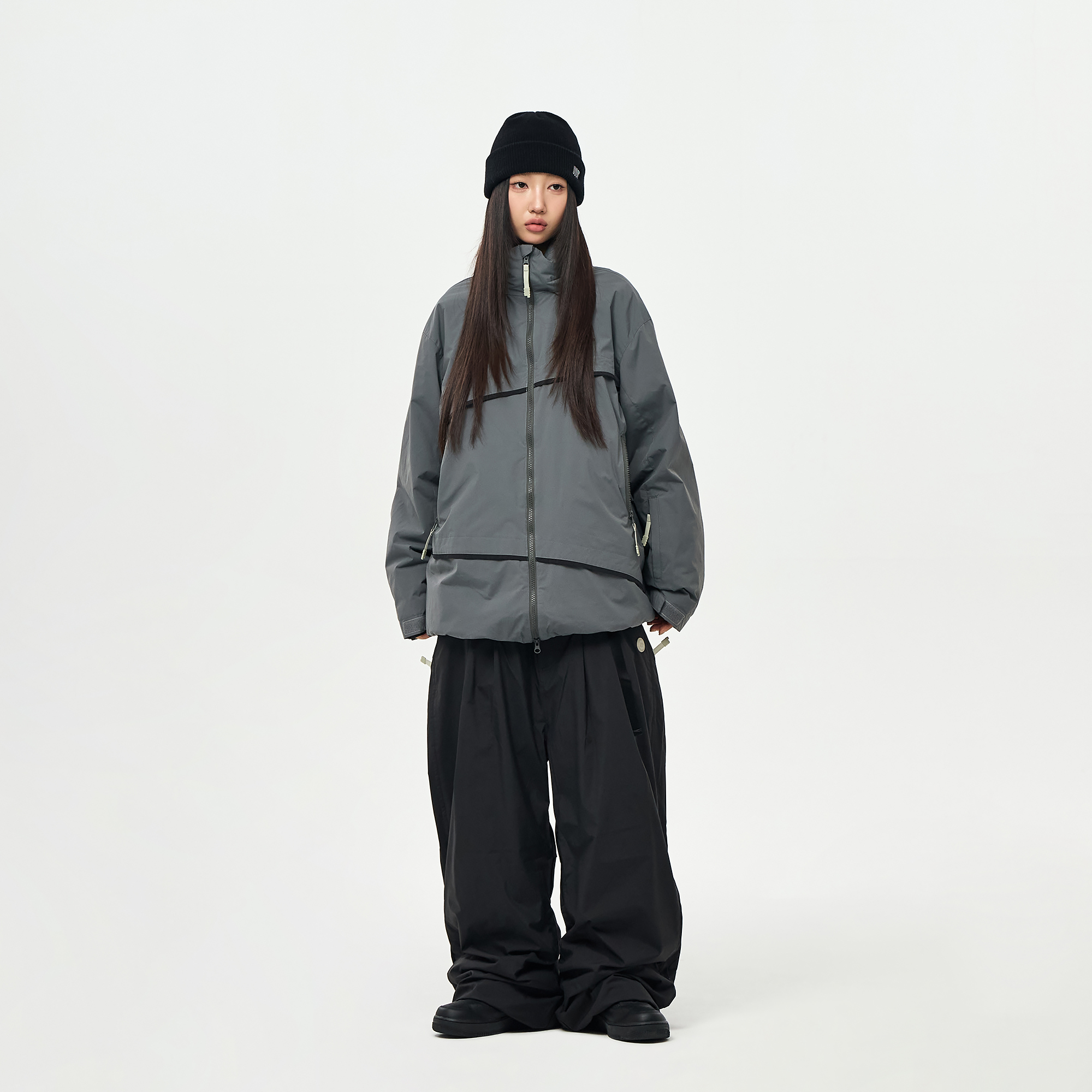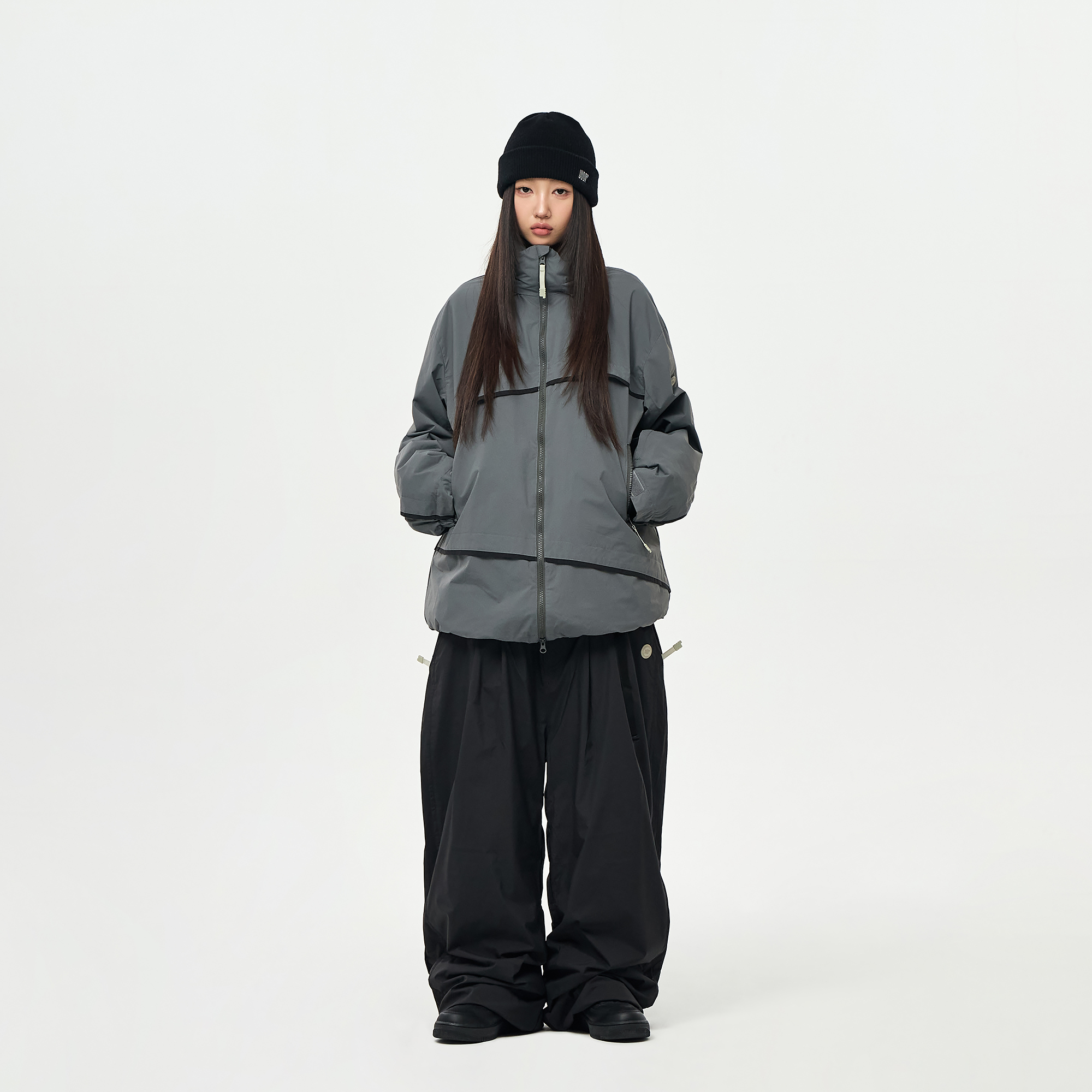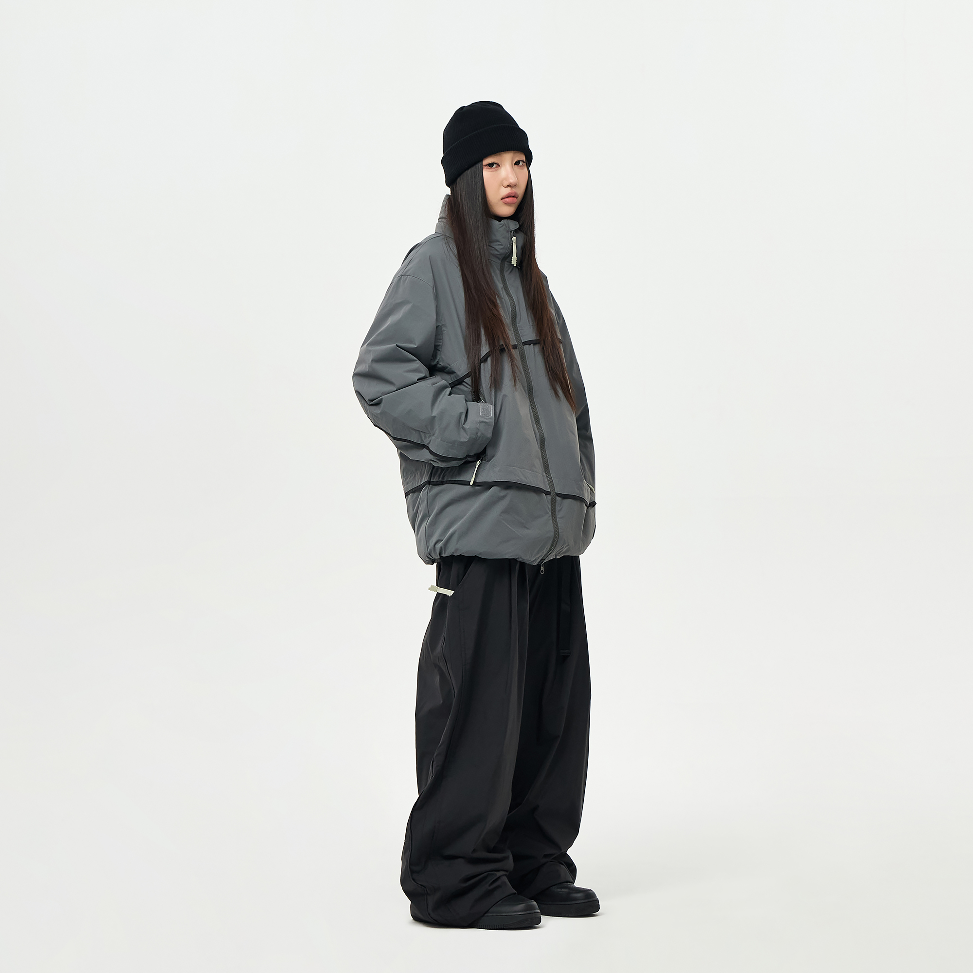 밑단의 스트링/스토퍼와 지퍼로 사이즈 조절이 가능하여 다양한 연출이 가능합니다.