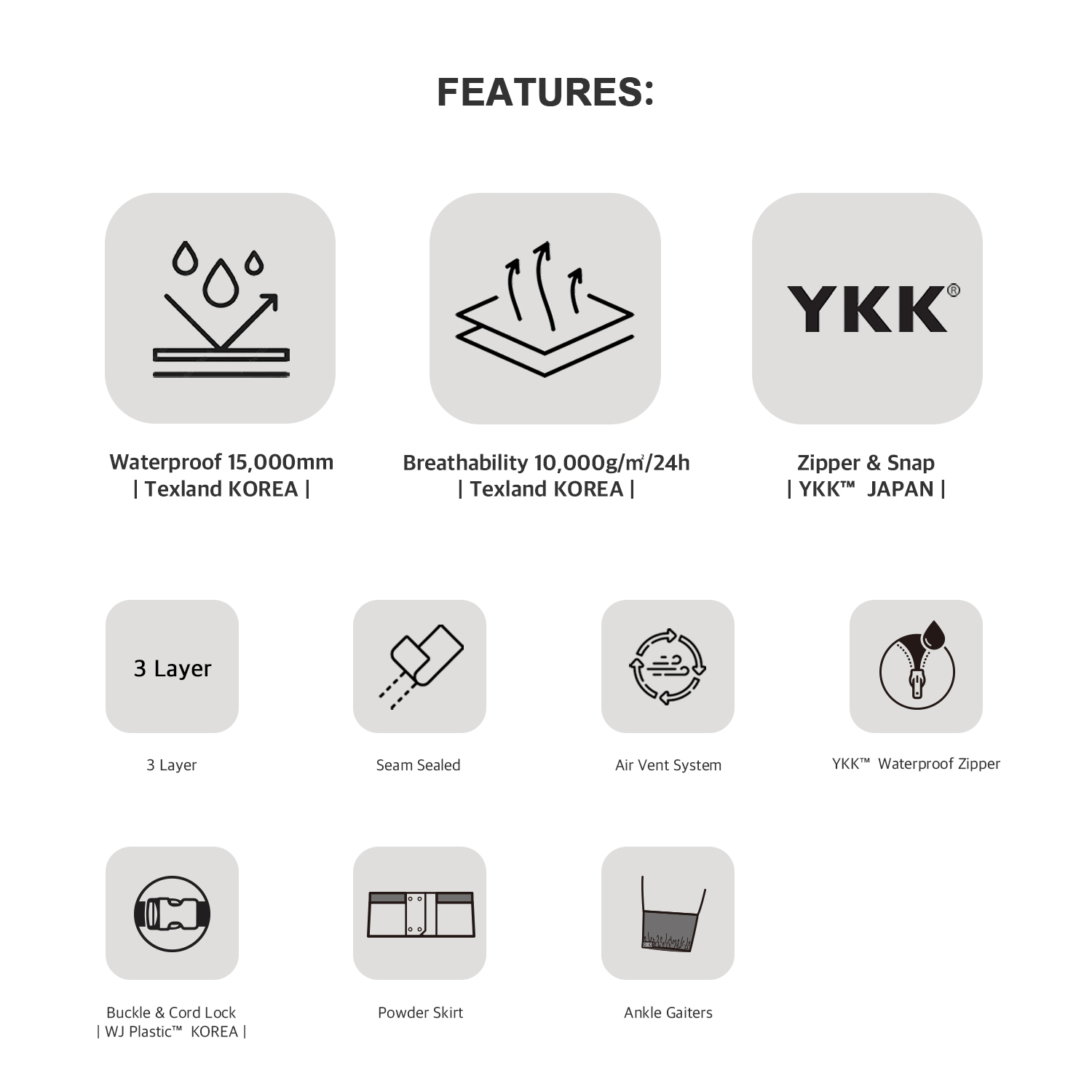 - Breathability : 10,000g/㎡/24h