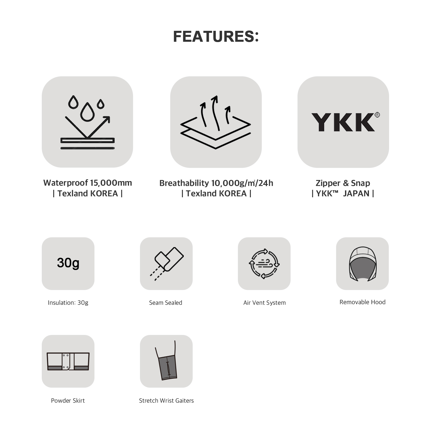 Powder Skirt 와 Wrist Gaiters 를 부착해 눈 유입을 방지하고, 보온성과 활동성을 모두 강화했습니다.