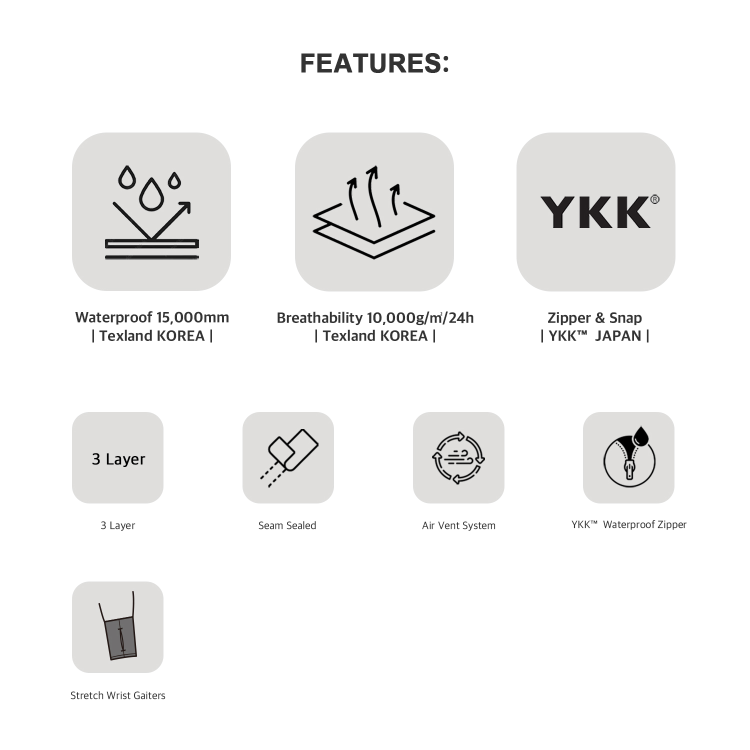 앞면 메인 지퍼와 가슴 포켓에 적용된 YKK™ 2-way 방수 지퍼는 뛰어난 내구성과 방수 기능을 제공하며,