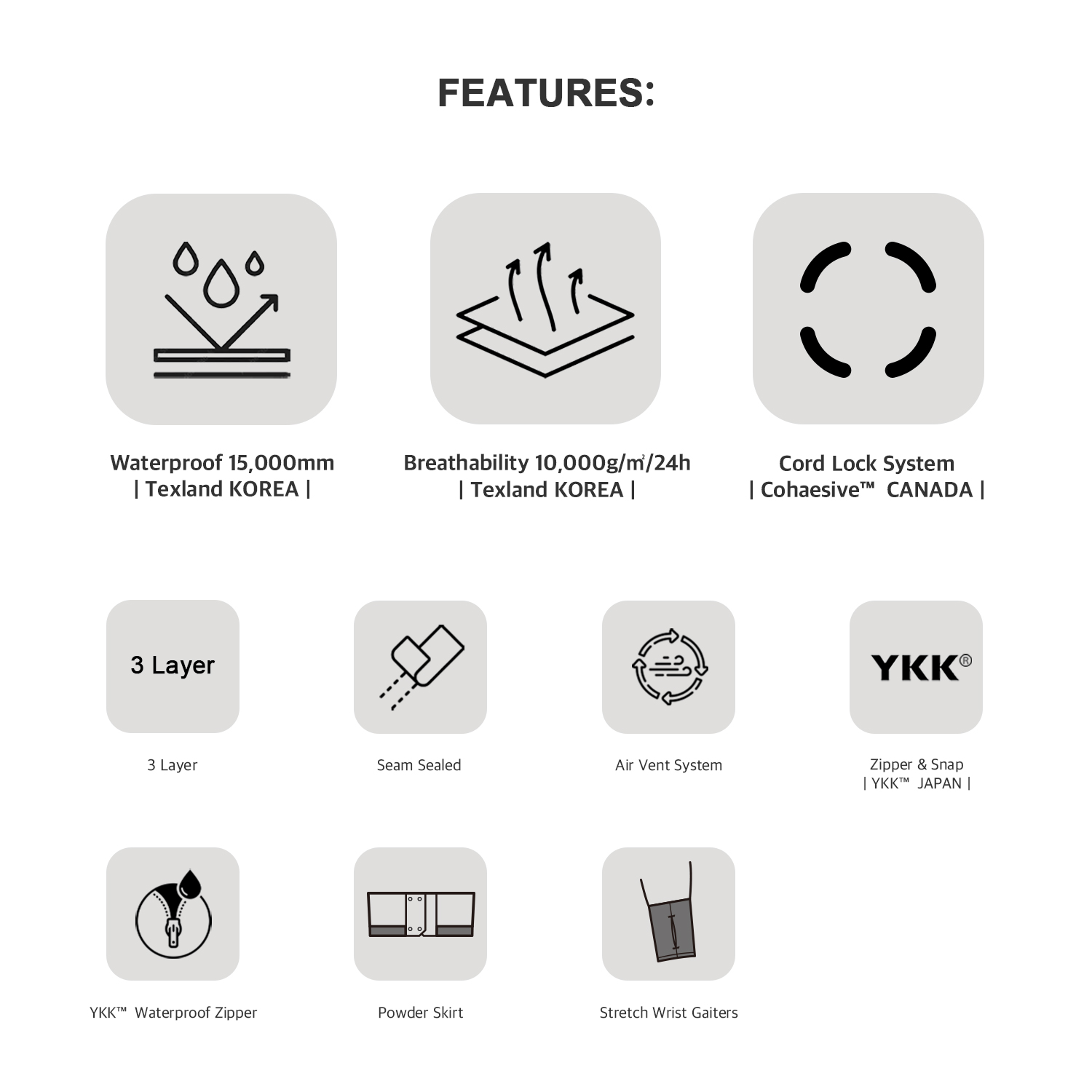 메인 부분에 적용된 YKK™ 2-way 방수 지퍼는 완벽한 방수성과 사용 편의성을 제공하며, 가슴과 양쪽 소매에 YKK™ 방수 지퍼 포켓을 배치해 실용성과 스타일을 동시에 잡았습니다.